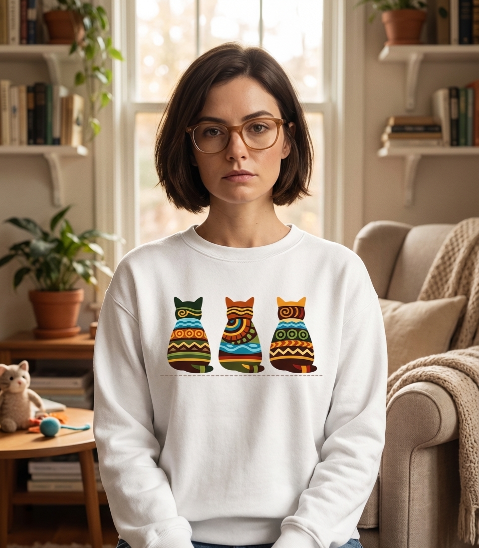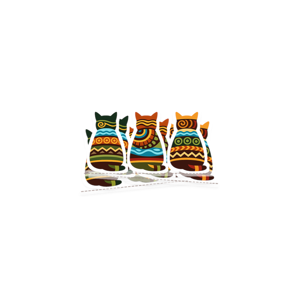 This graphic features three stylized cats, each adorned with distinct, colorful patterns inspired by folk art and tribal aesthetics. The cats are depicted in a sitting pose, showcasing a harmonious blend of earthy tones and bright accents.