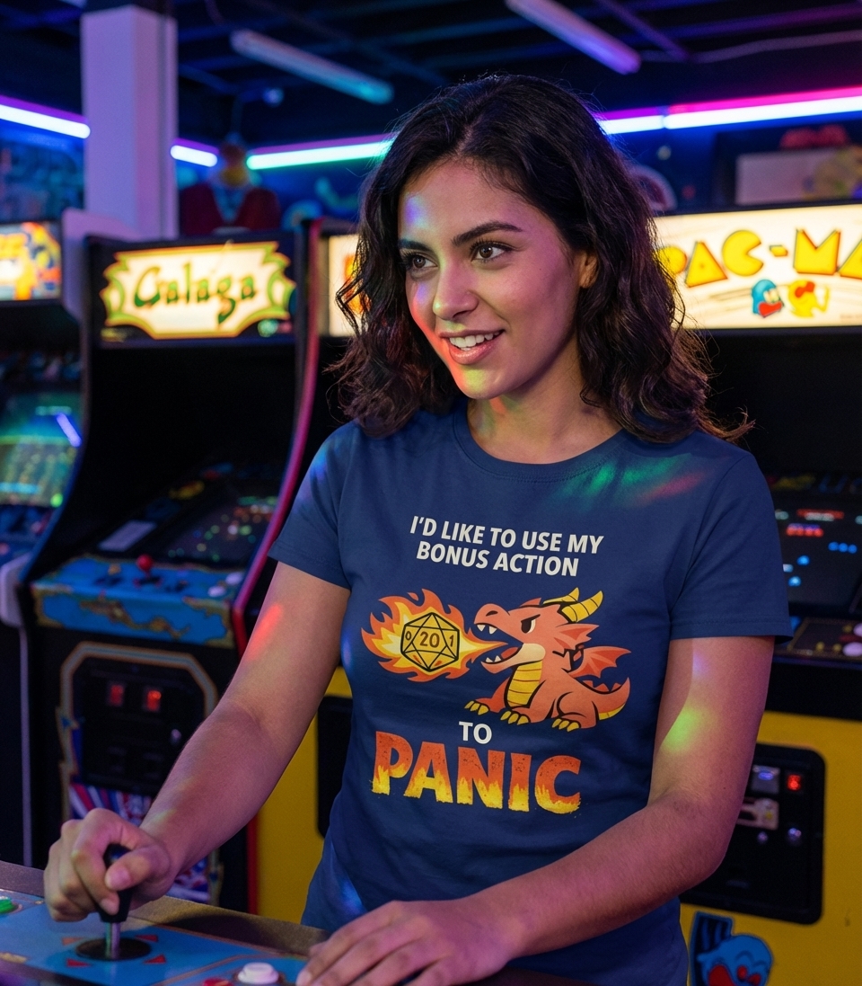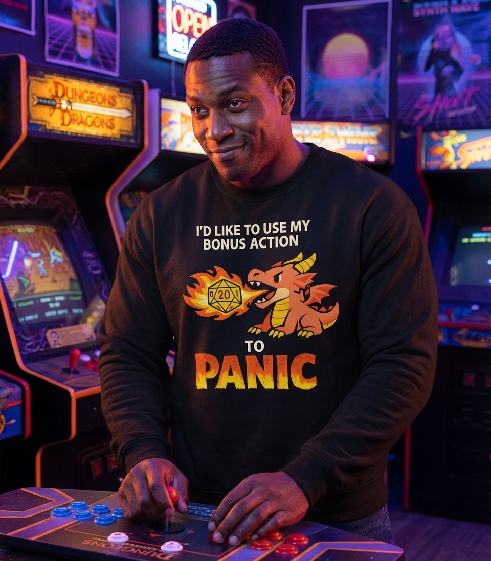 The 'Bonus Action Panic' phrase captures the lifestyle of passionate tabletop roleplayers who spend their days strategizing encounters, rolling critical failures, and reacting hilariously to in-game surprises.