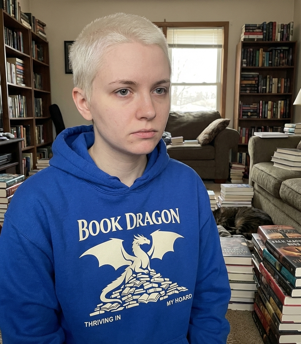 The "Book Dragon" phrase captures the unique, humorous self-identification of passionate readers who find joy in collecting and cherishing their literary treasures.