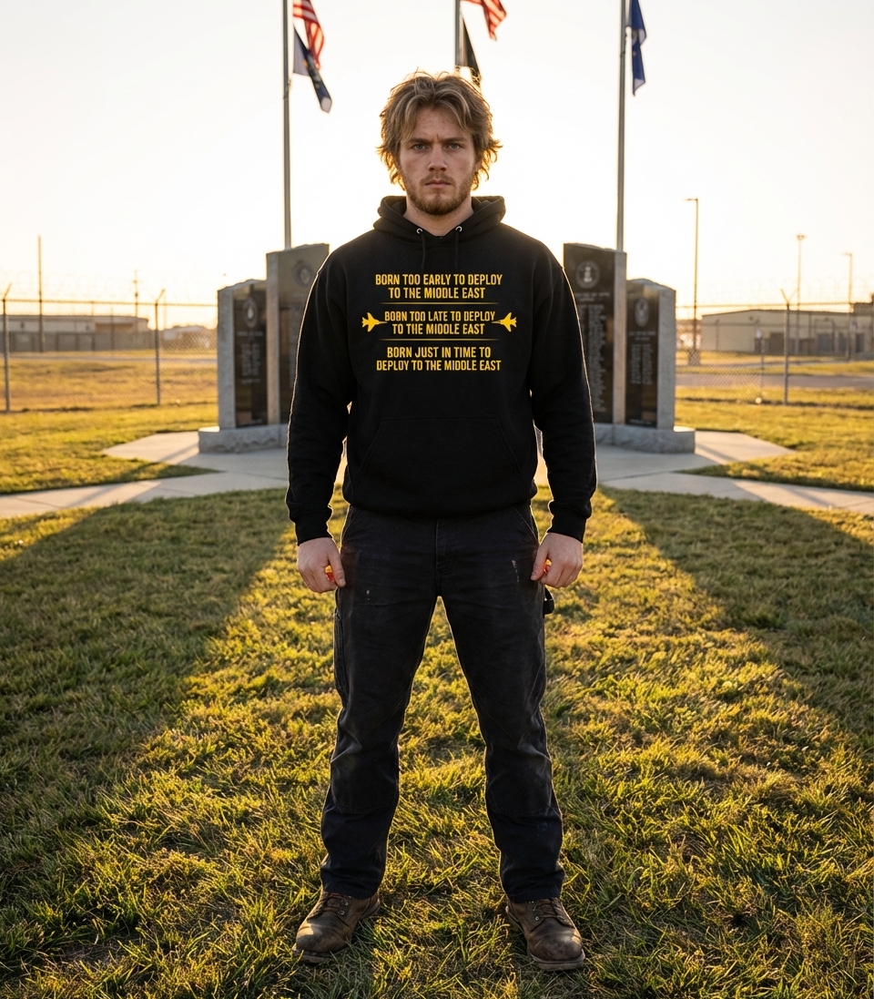 The phrase "Born Too Early/Late/Just in Time to Deploy to the Middle East" is a common piece of military gallows humor or dark satire. It reflects the cyclical nature of conflicts and deployments, suggesting an unavoidable destiny for service members across generations.