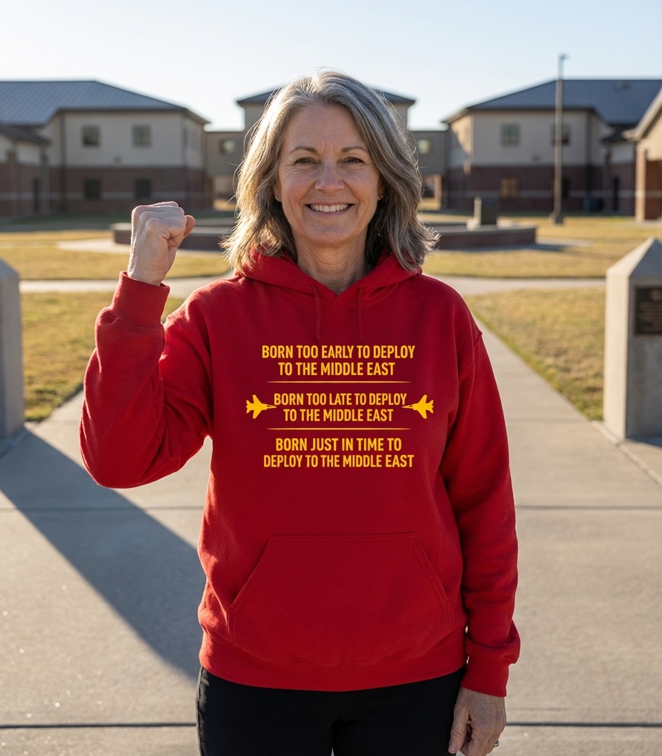 This design features a humorous and somewhat cynical take on military deployment, specifically to the Middle East. It plays on the idea that regardless of when one is born, there's always an opportune moment for service and deployment.
