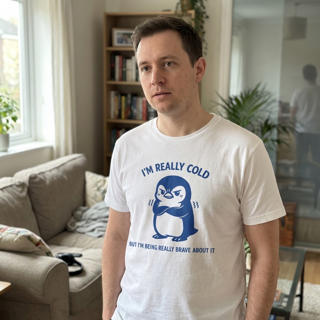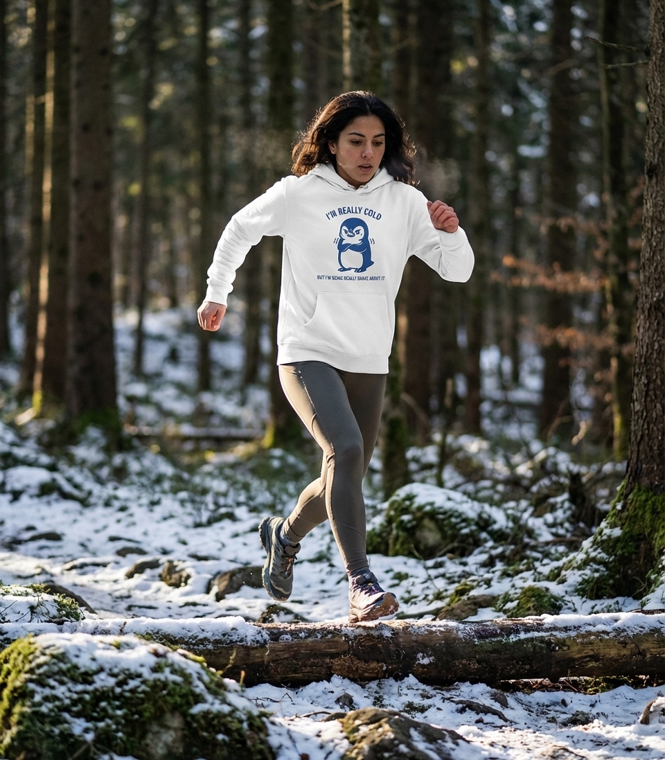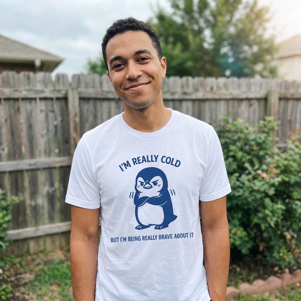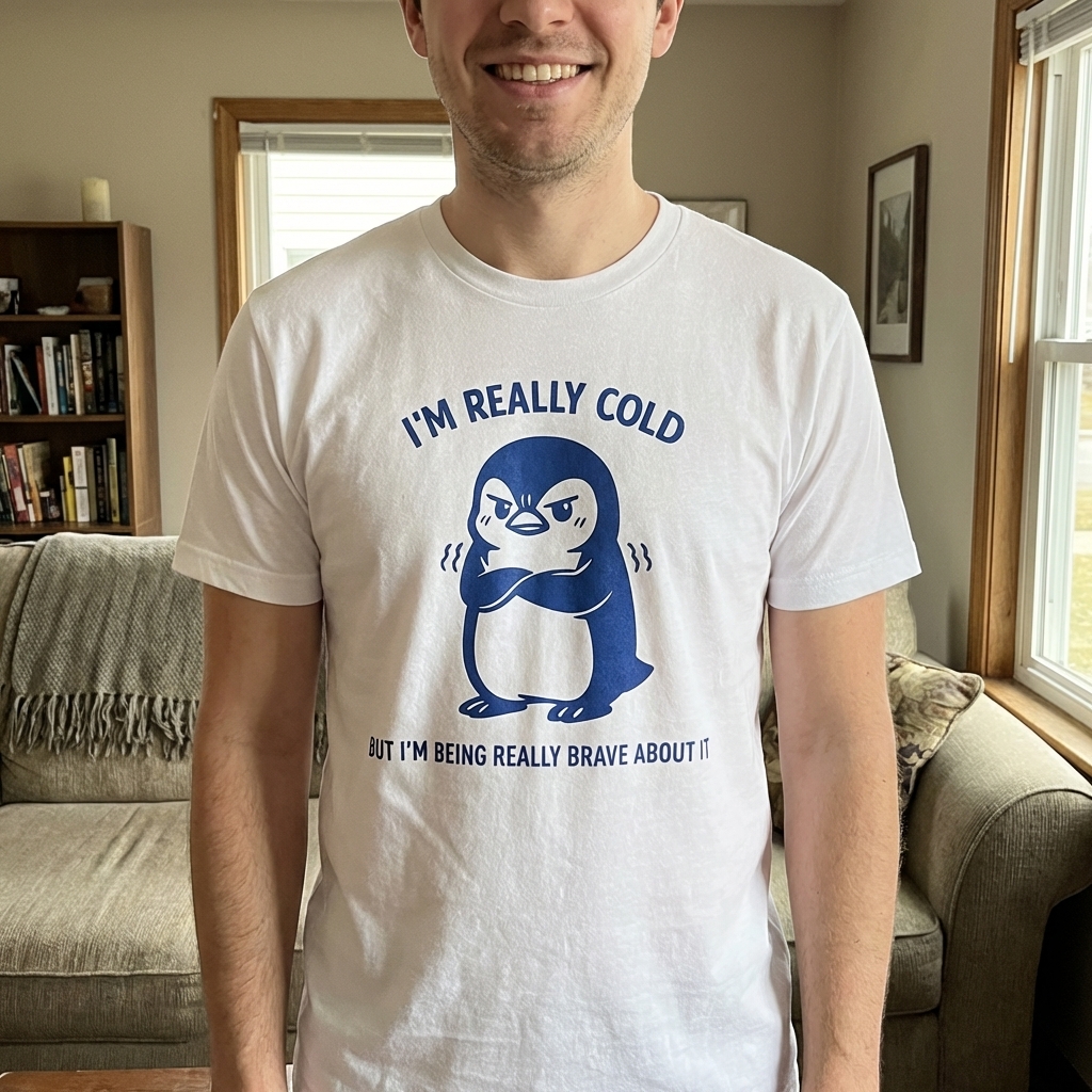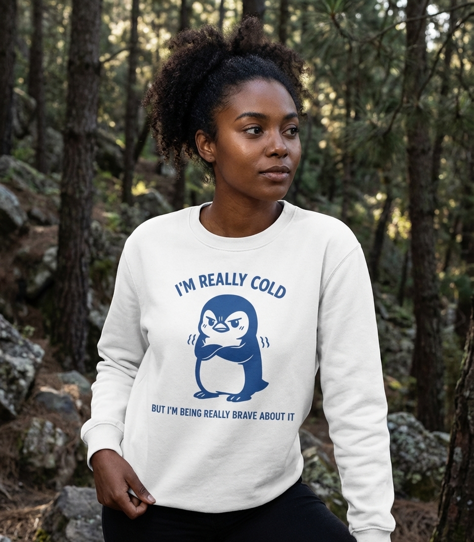 This design showcases a charmingly grumpy blue penguin, shivering with its arms crossed, yet maintaining a defiant stance. The illustration pairs a relatable feeling of being cold with a humorous declaration of bravery.