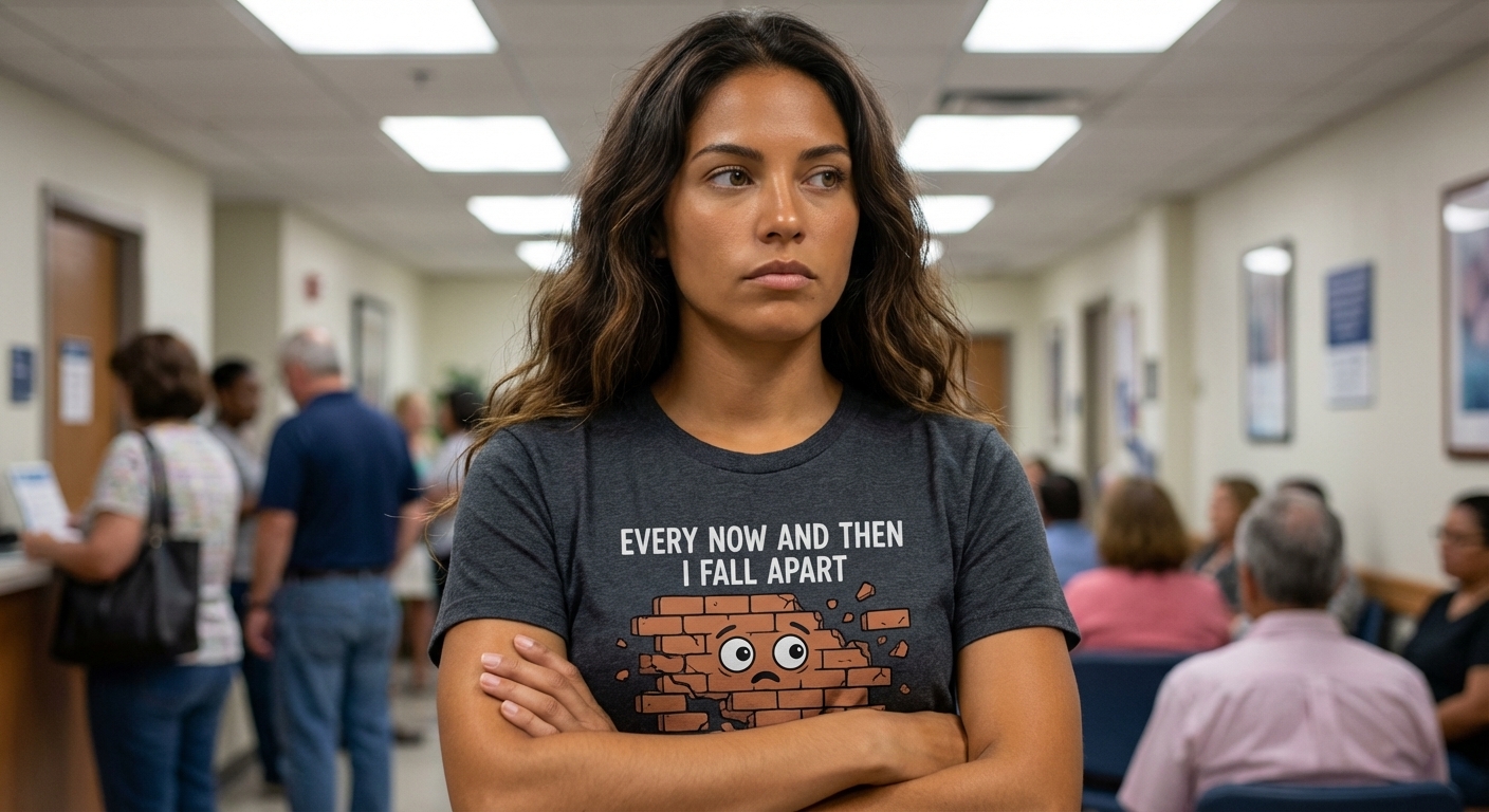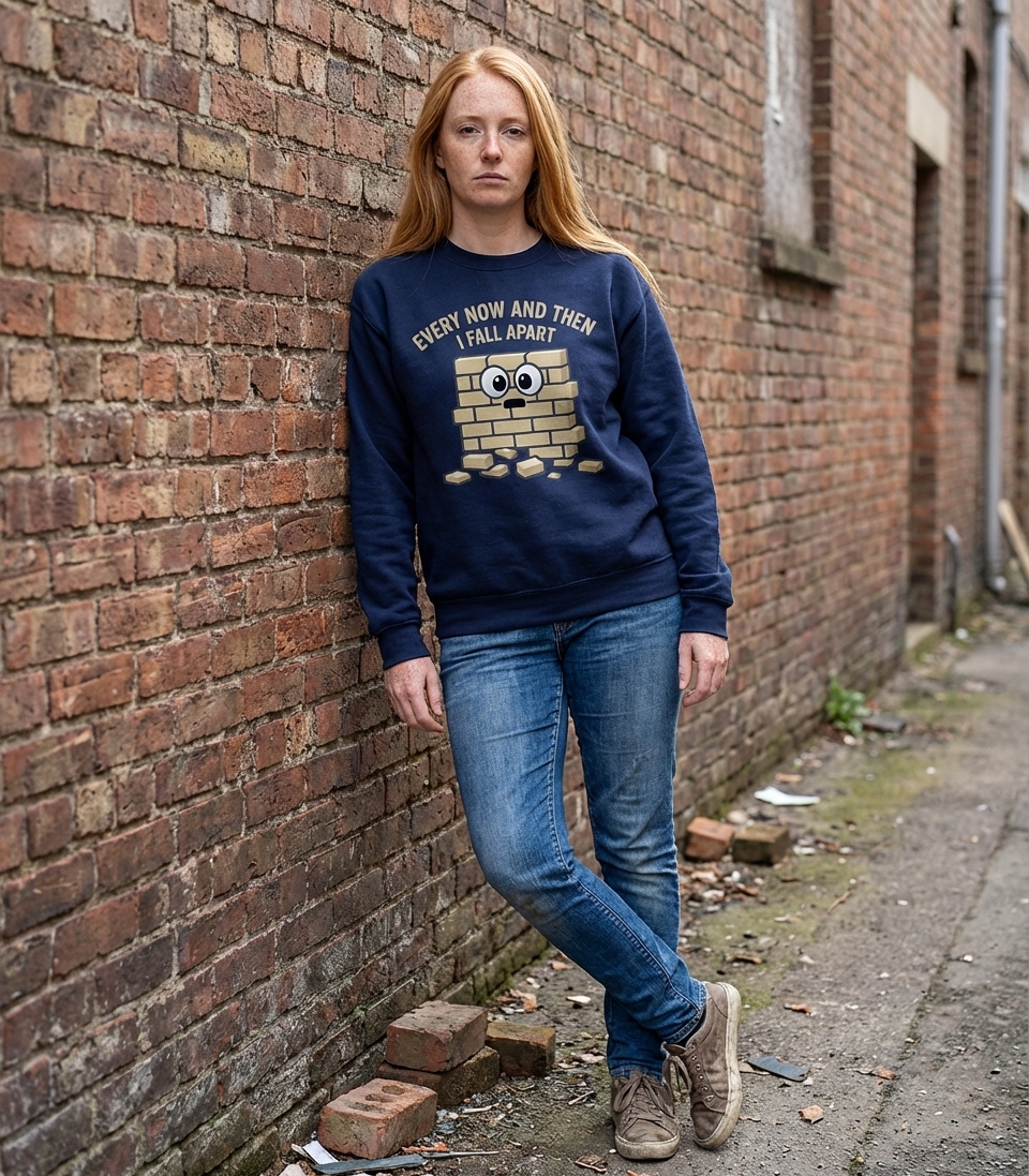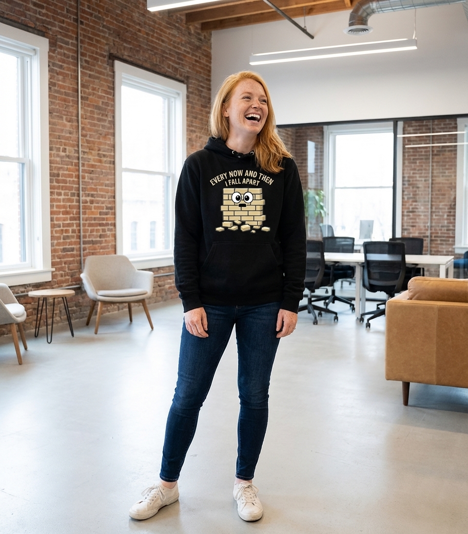 The "Every Now and Then I Fall Apart" phrase captures the relatable struggles of individuals navigating daily life challenges with a touch of self-aware humor.