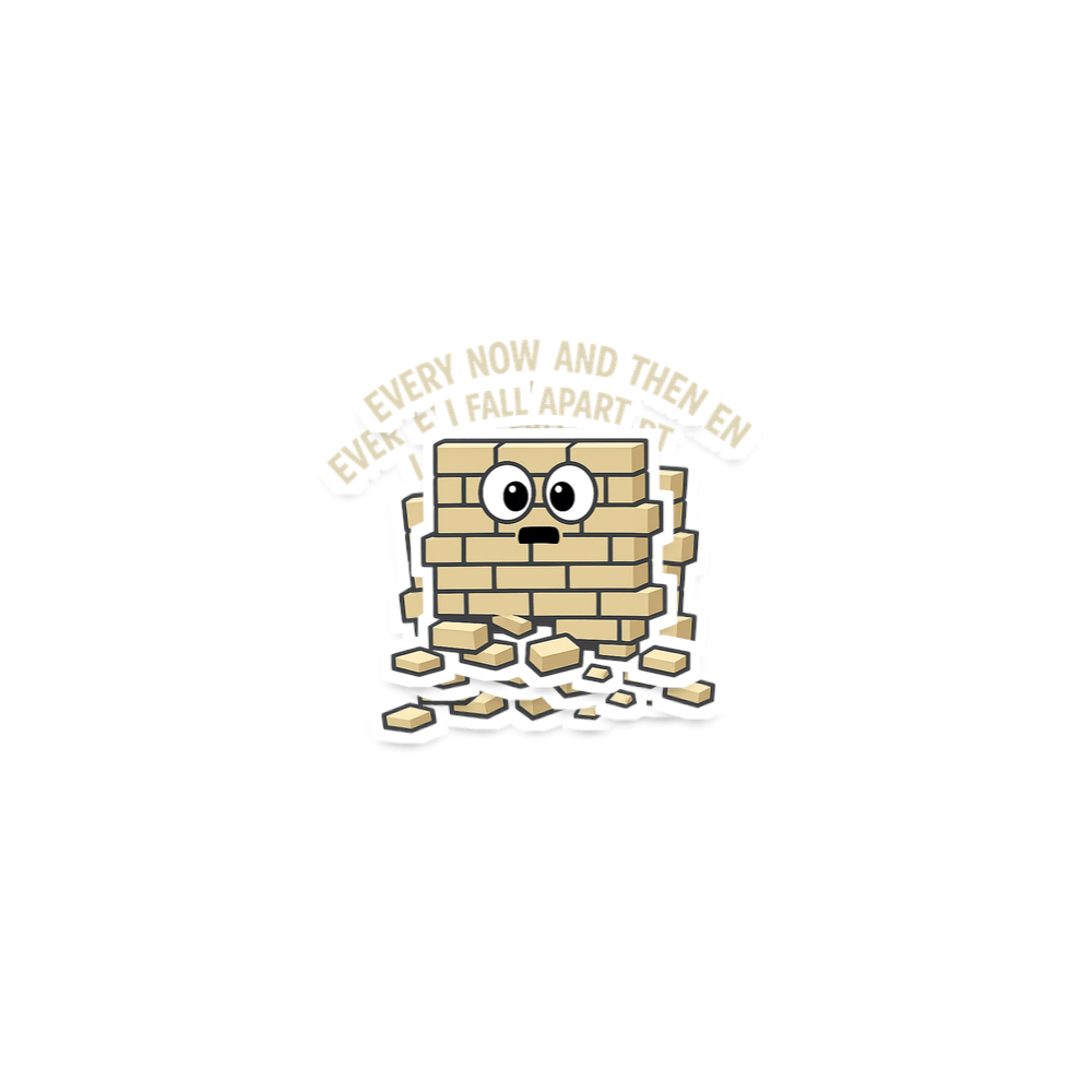 This unique graphic features a charming, sad-faced brick wall literally crumbling at its base, perfectly illustrating the idiom "Every Now and Then I Fall Apart." The minimalist cartoon style brings a lighthearted touch to a universally understood feeling of being overwhelmed. It serves as a visual metaphor for moments of emotional or mental fatigue.