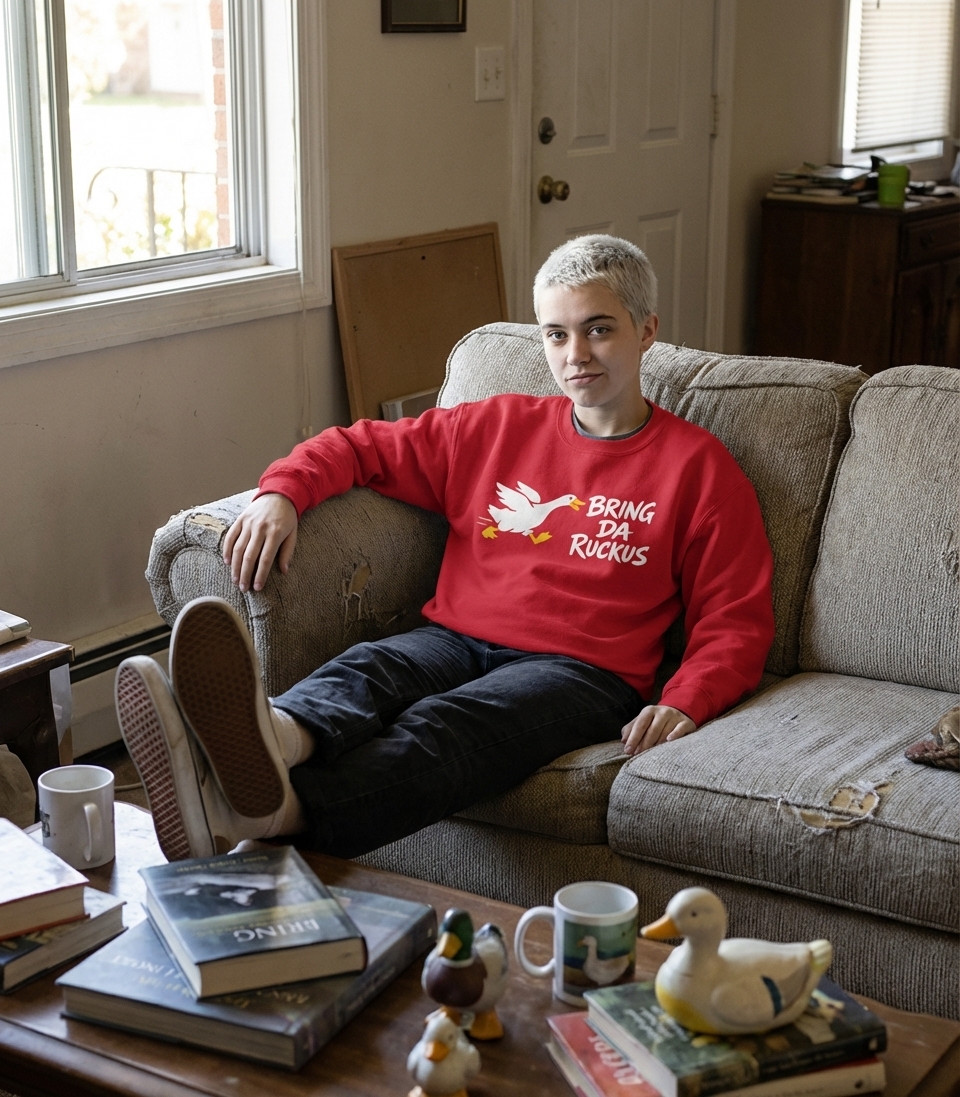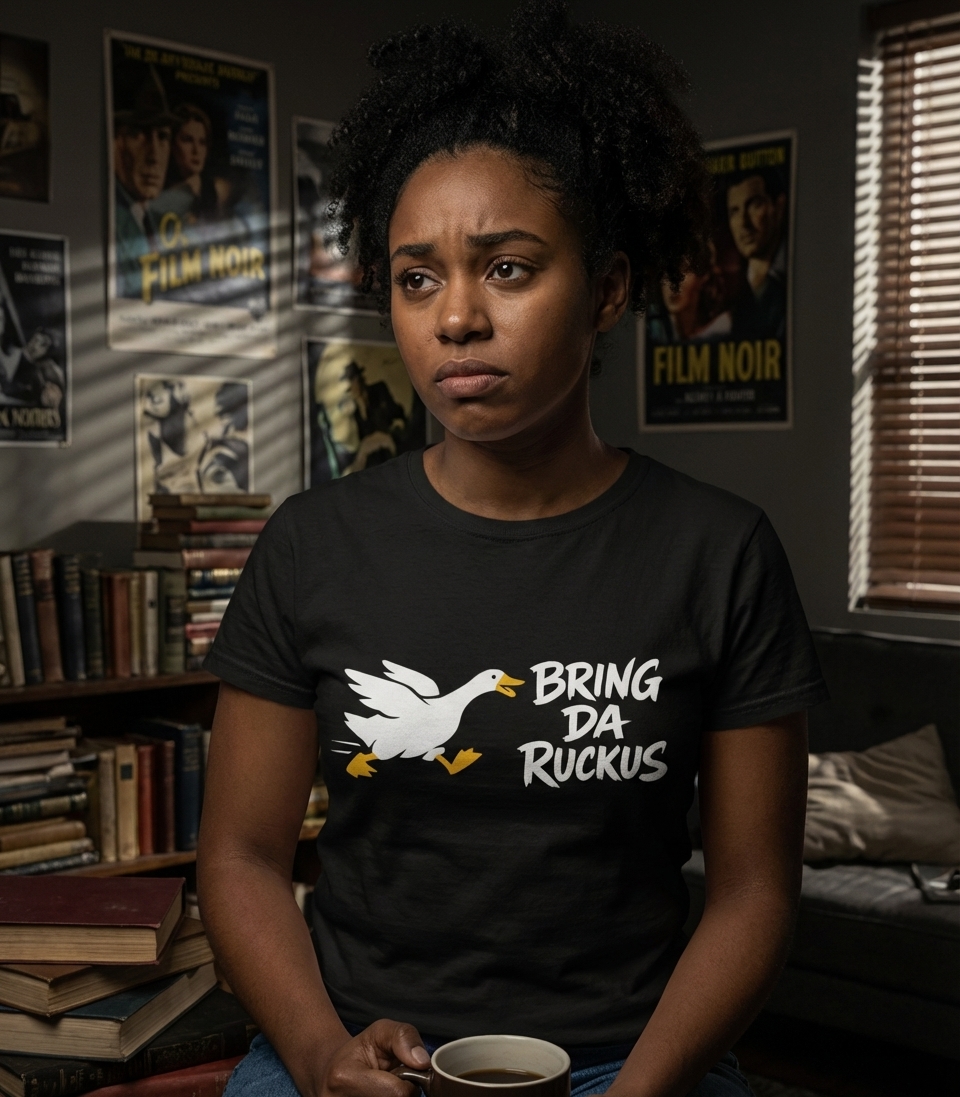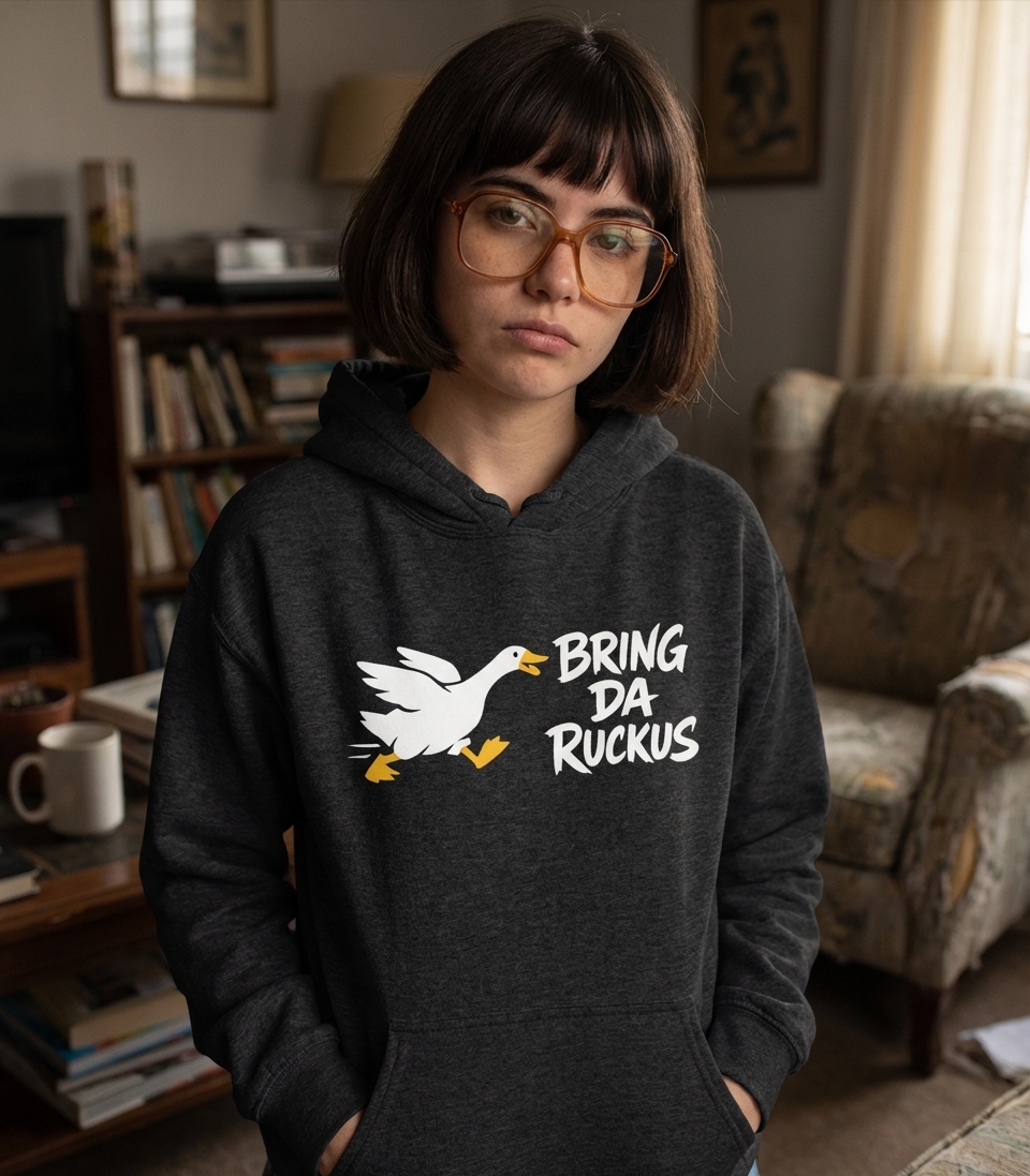 The 'Bring Da Ruckus' phrase captures the bold and spirited nature of individuals ready to create a stir, just like a determined duck on a mission.