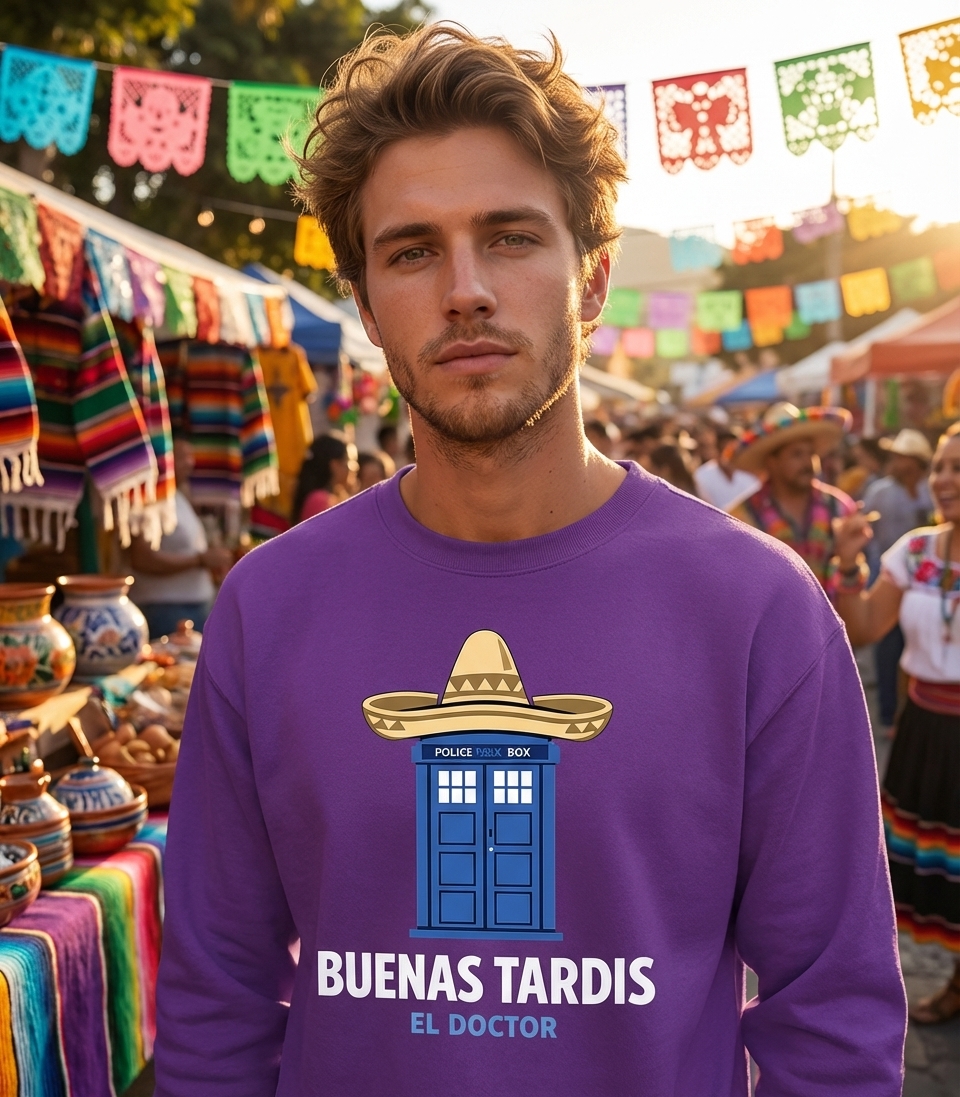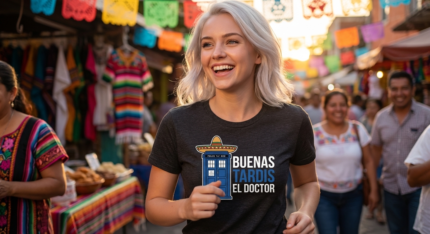 The phrase "BUENAS TARDIS" is a clever pun on the Spanish greeting "Buenas Tardes" (Good afternoon/evening) and "TARDIS," the Doctor's iconic time machine. Below it, "EL DOCTOR" translates to "The Doctor" in Spanish, directly referencing the beloved time-traveling protagonist.