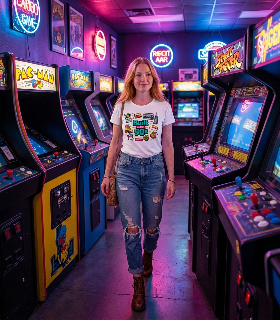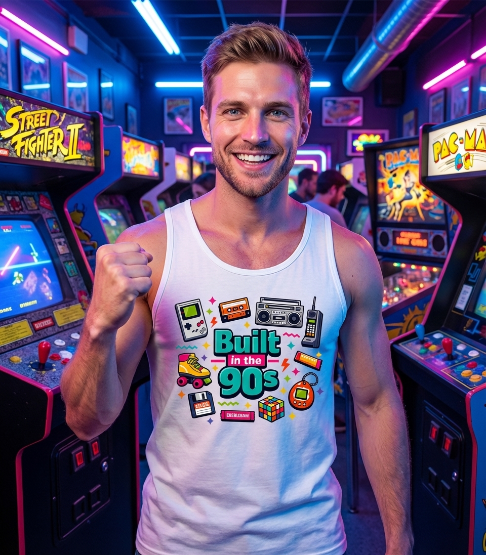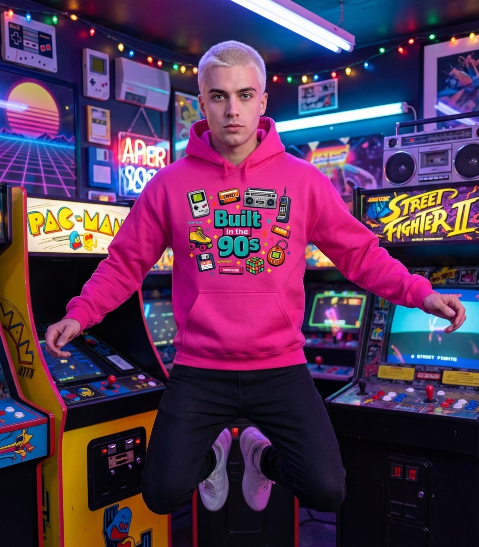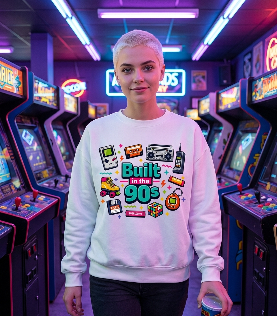 The "Built in the 90s" phrase captures the lifestyle of those who remember pixelated games, cassette mixtapes, and dial-up internet with fond nostalgia.