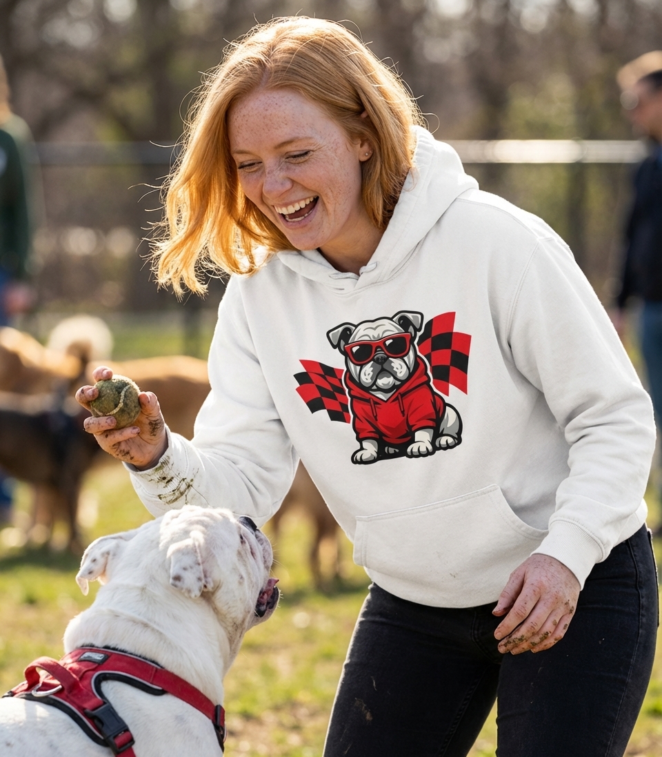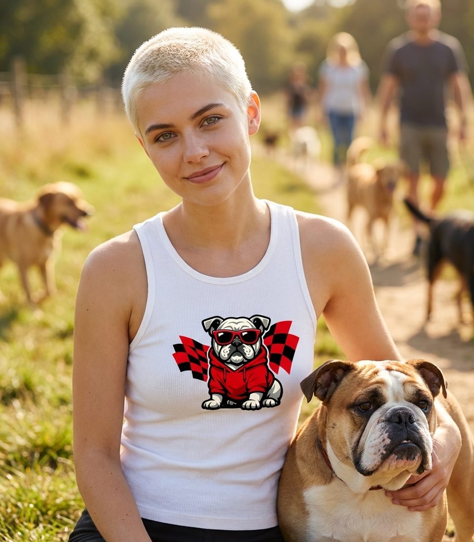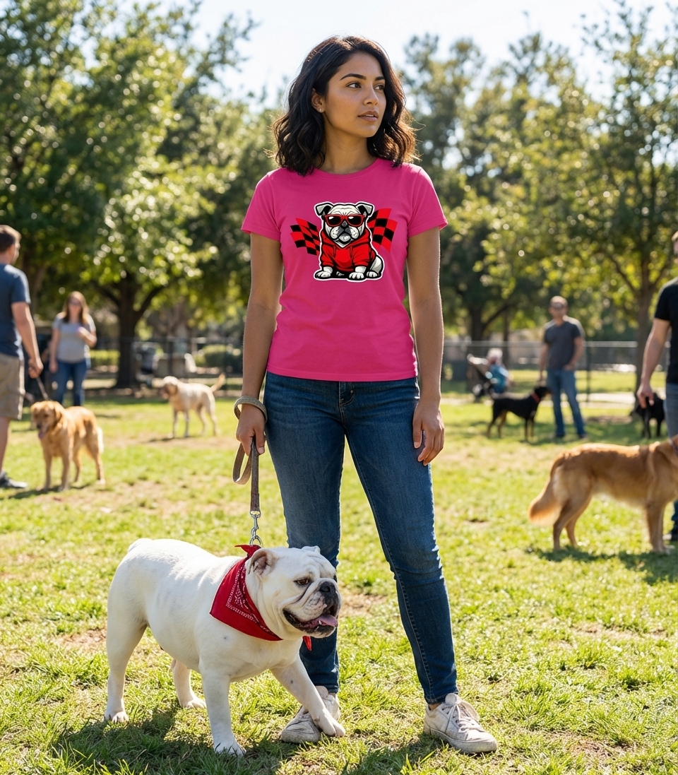 The imagery combines the lovable nature of a bulldog with the thrill and excitement of motorsports. It signifies a playful yet bold personality, ready to hit the track or simply enjoy the race day atmosphere.