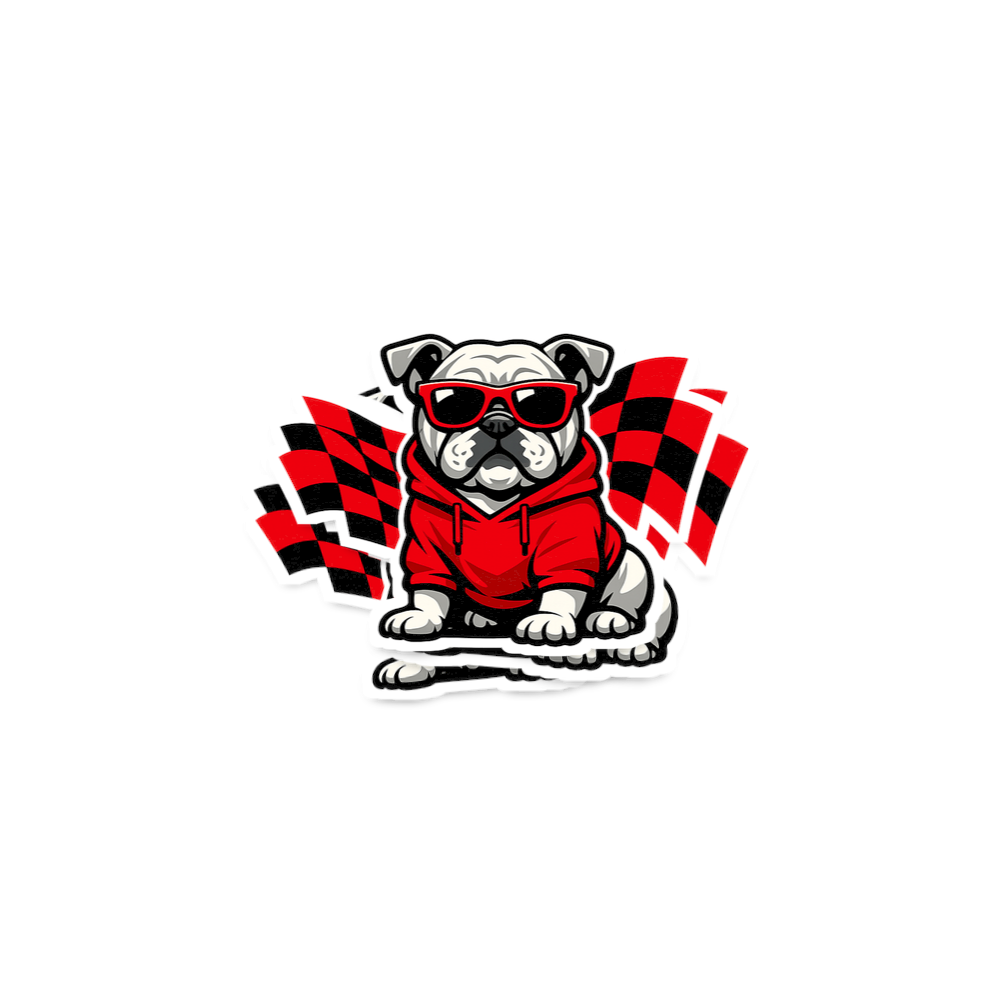 This artwork features a stylish bulldog wearing a red hoodie and cool red sunglasses. It's an energetic illustration, perfectly framed by classic red and black checkered racing flags on either side.