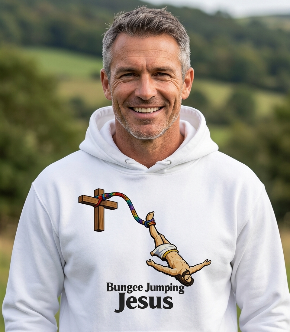 This unique t-shirt artwork features Jesus in an unexpected and humorous scenario: bungee jumping. The iconic figure is depicted mid-air, connected to a traditional wooden cross by a vibrant, rainbow-colored bungee cord. The scene playfully recontextualizes religious imagery with a modern, adventurous twist.