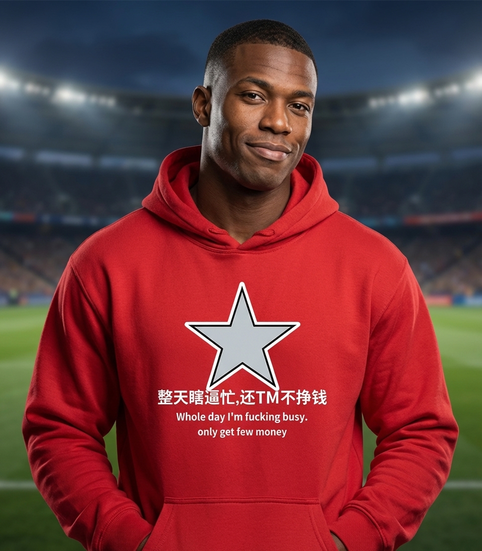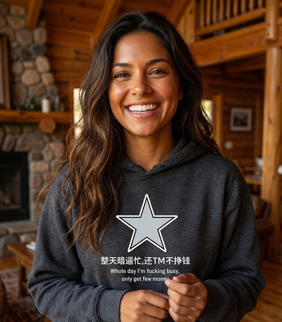 This stark design features a simple grey star with a clean white outline, set against a black background. The impactful Chinese phrase "整天瞎逼忙,还TM不挣钱" is prominently displayed, with its candid English translation "Whole day I'm fucking busy. only get few money" directly below.
