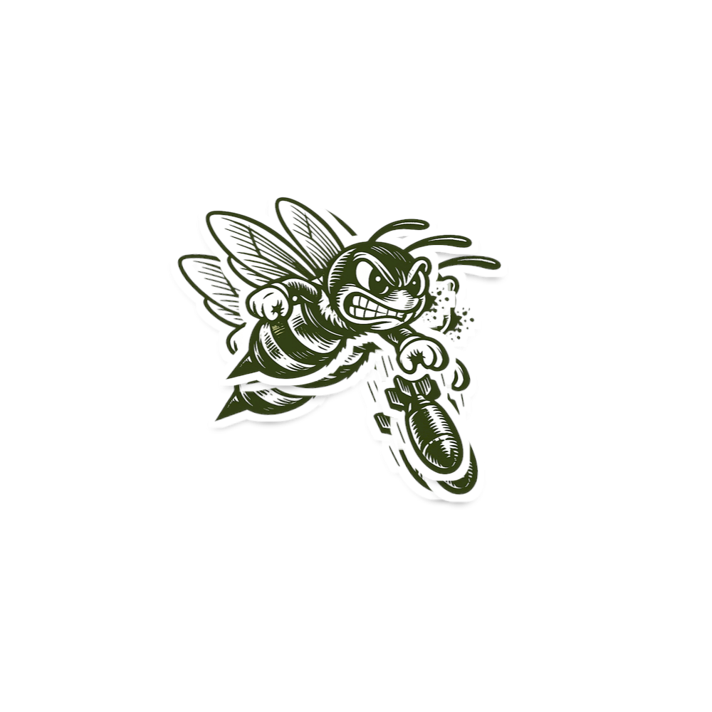 The artwork features a stylized, angry hornet aggressively descending while dropping a bomb. Its design evokes classic military insignia and squadron mascots from aviation history. The limited color palette of olive green and white on black enhances its bold, vintage appeal.