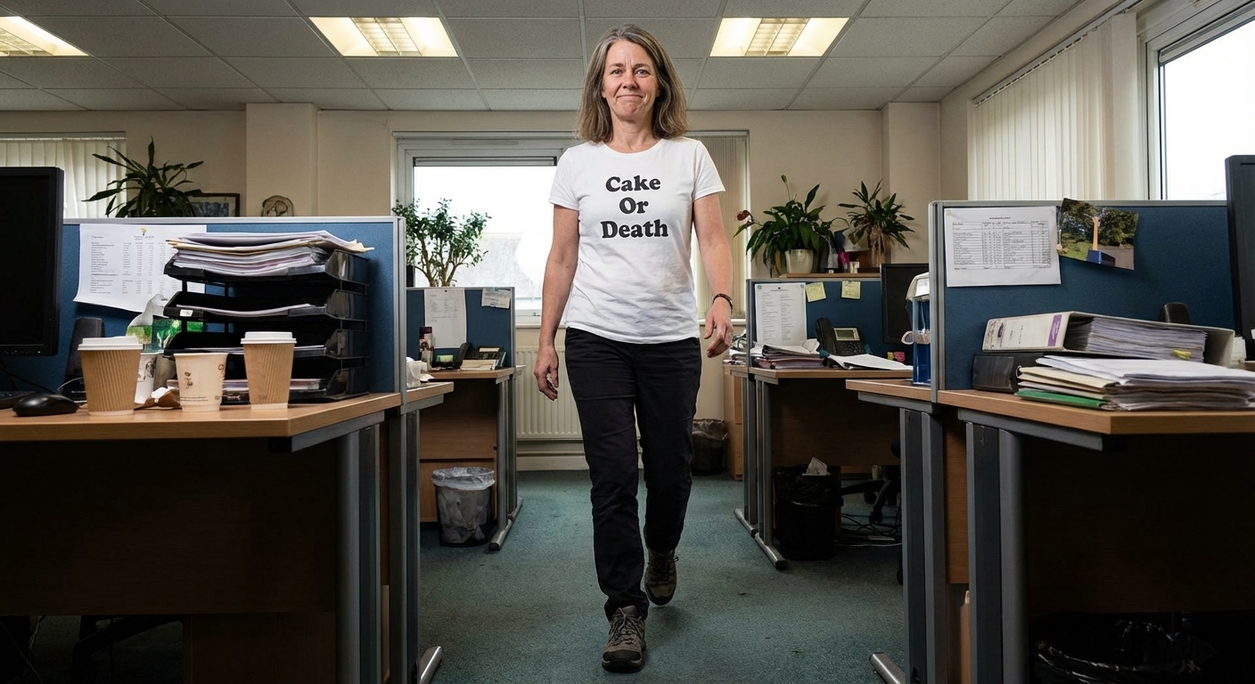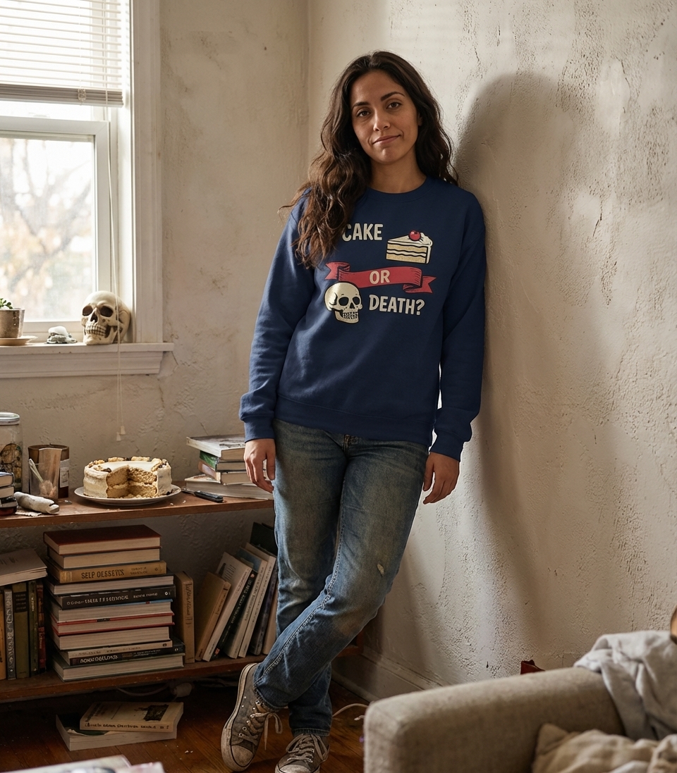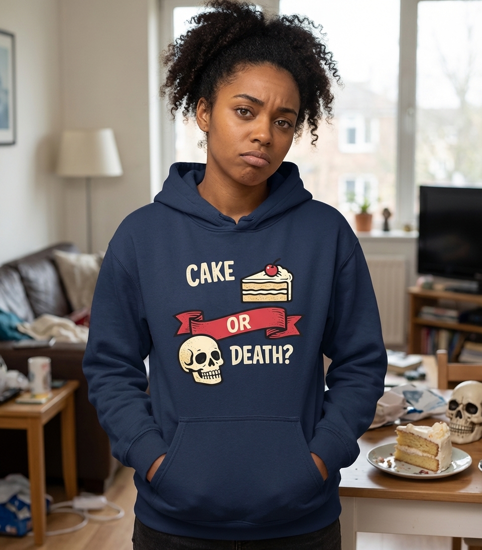 The "Cake Or Death" phrase captures the lifestyle of comedy fans who appreciate witty dilemmas, classic stand-up, and a touch of the absurd.