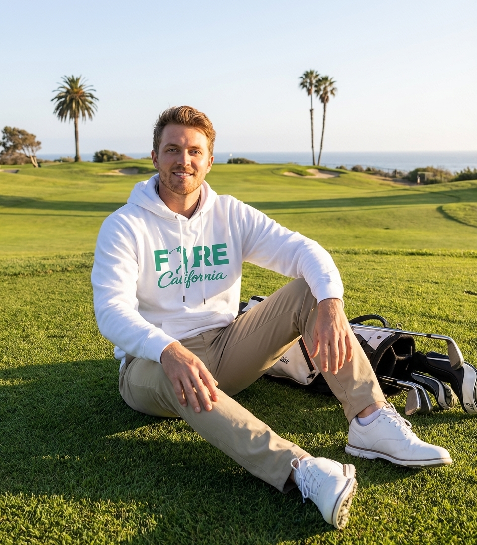 The 'FORE California' design captures the lifestyle of passionate golfers who enjoy the Golden State's courses, perfect swings, and scenic views.