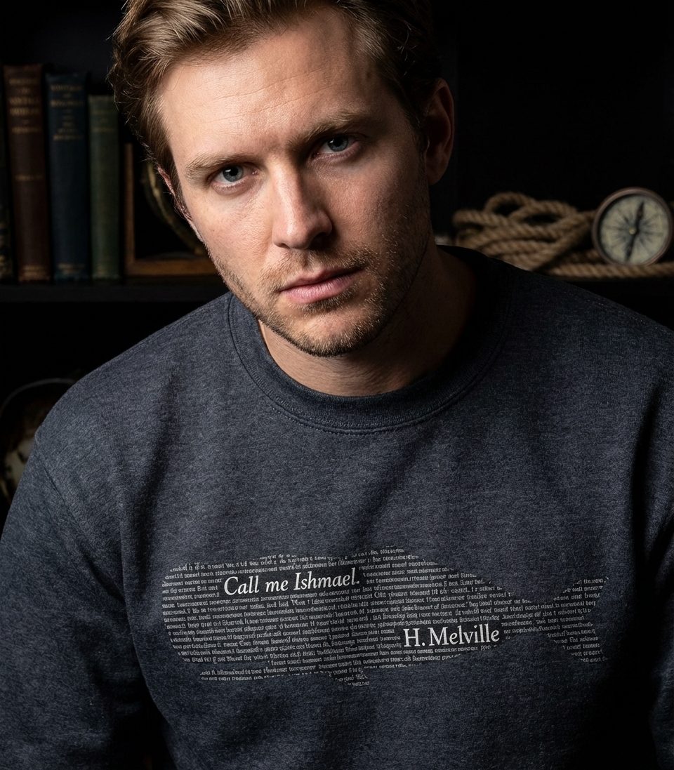 The phrase 'Call me Ishmael' instantly identifies the design with Moby Dick, one of the greatest American novels. It signifies a deep appreciation for classic literature, epic adventures, and the profound philosophical questions explored in Melville's masterpiece.