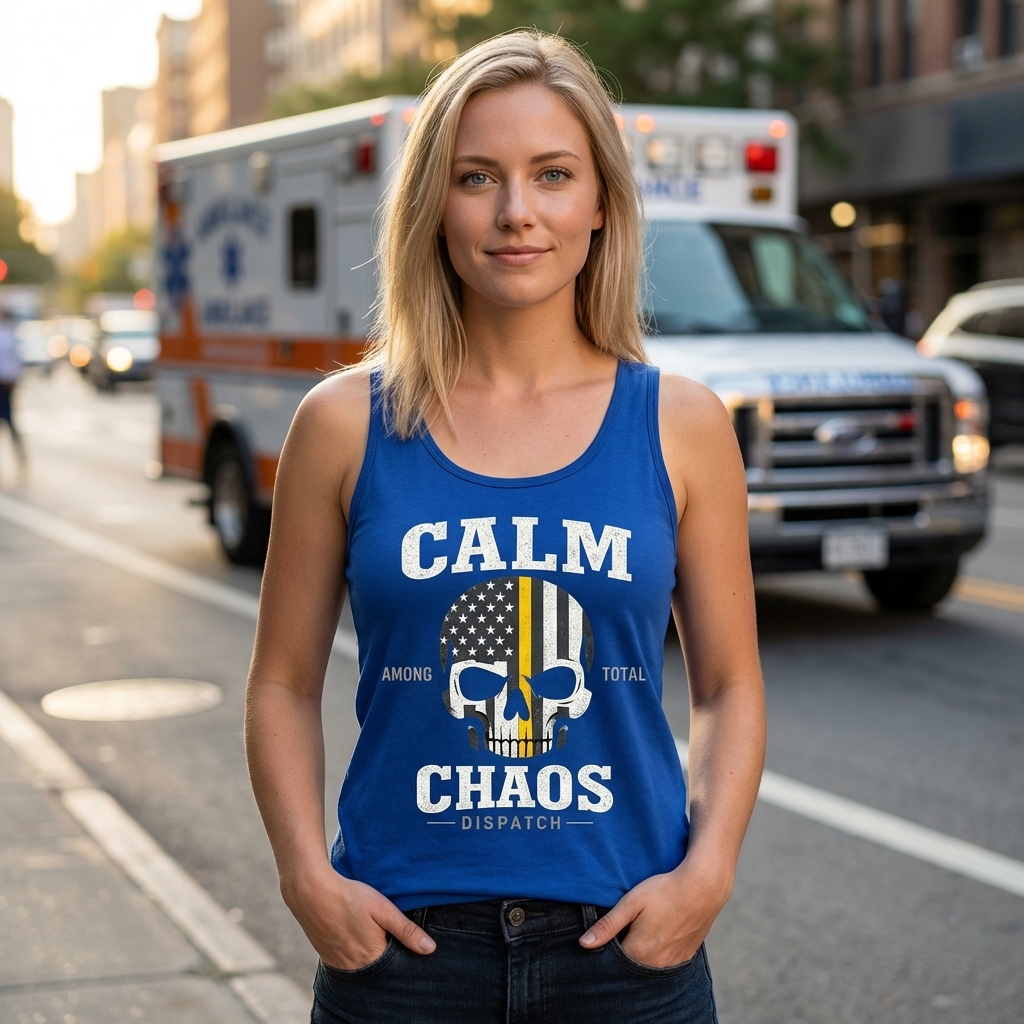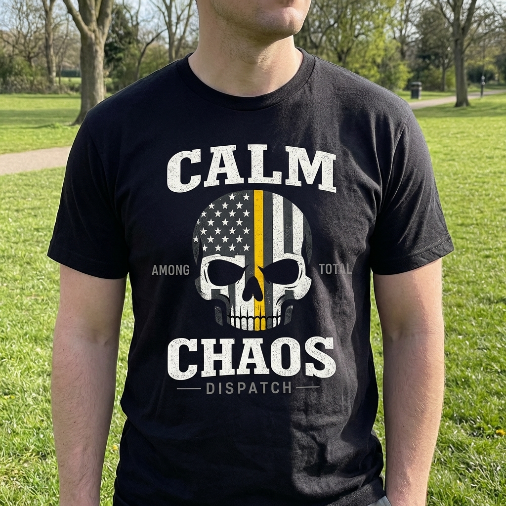 This design features a distressed skull graphic infused with the American flag, prominently featuring the Thin Yellow Line. It visually represents the strength and steadfastness required in emergency dispatch roles. The artwork combines patriotic symbolism with a powerful message of resilience.