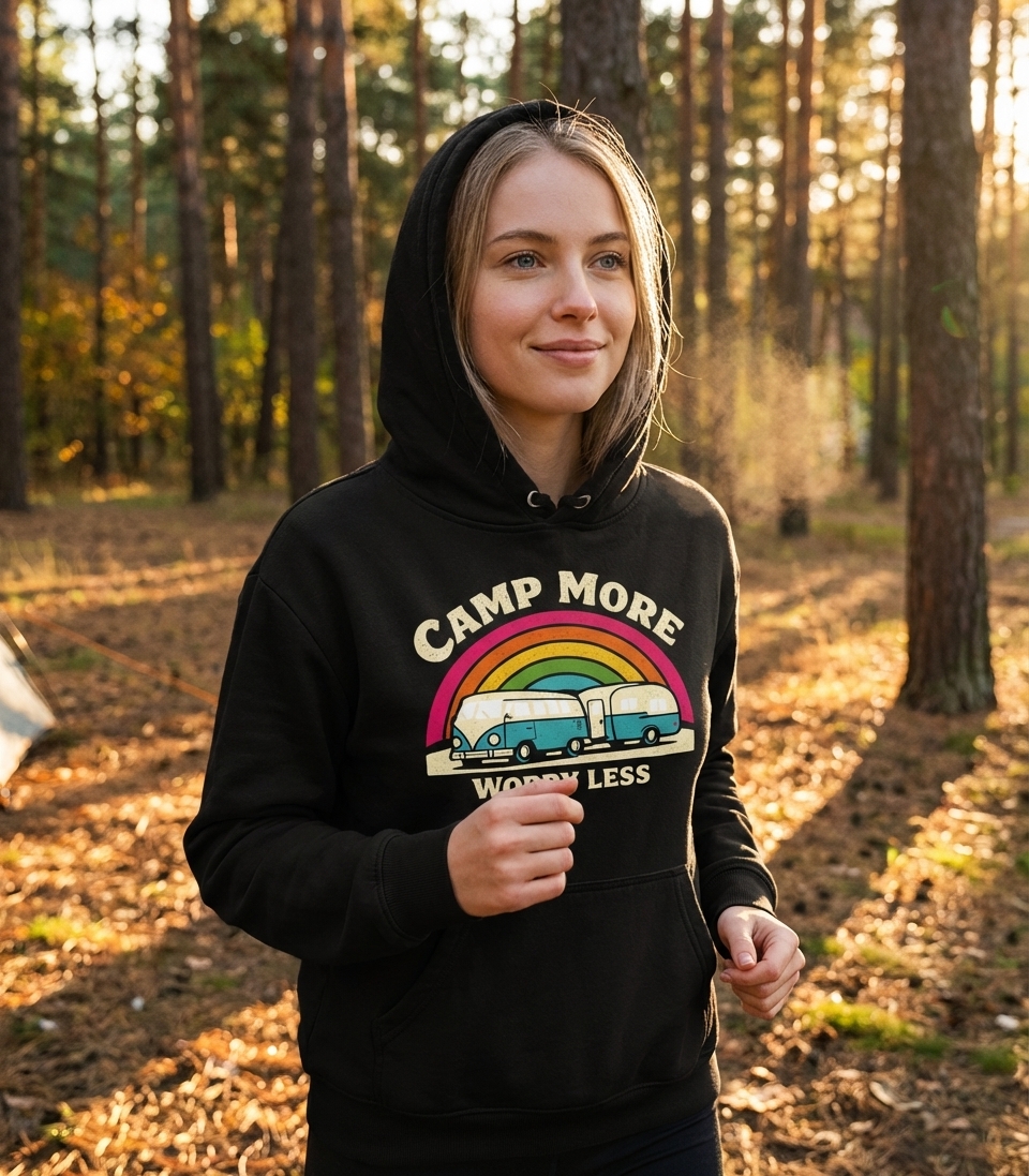 The 'Camp More Worry Less' phrase captures the lifestyle of passionate outdoor enthusiasts who spend their days exploring, relaxing, and embracing nature.