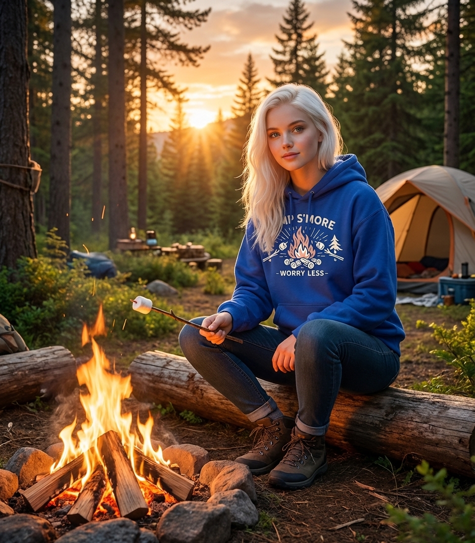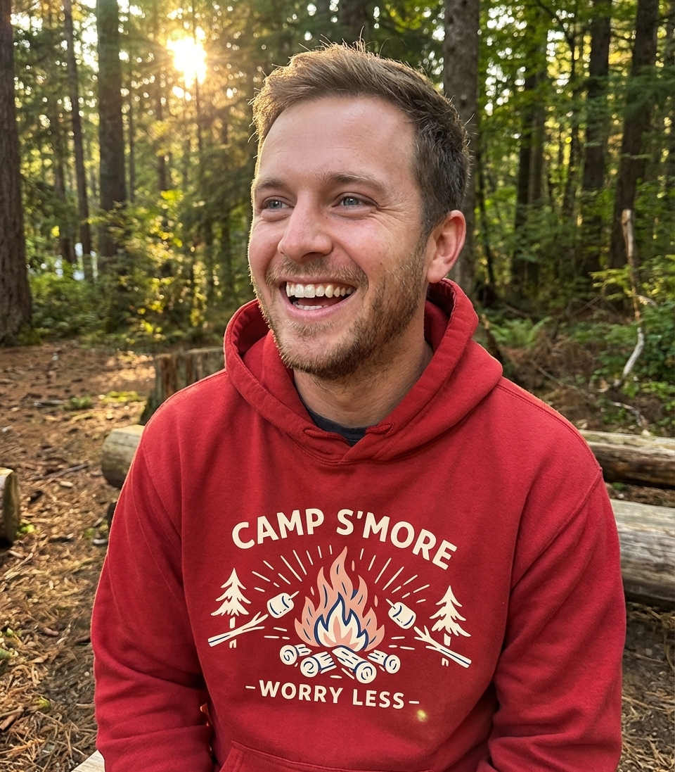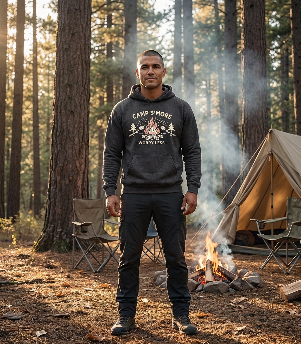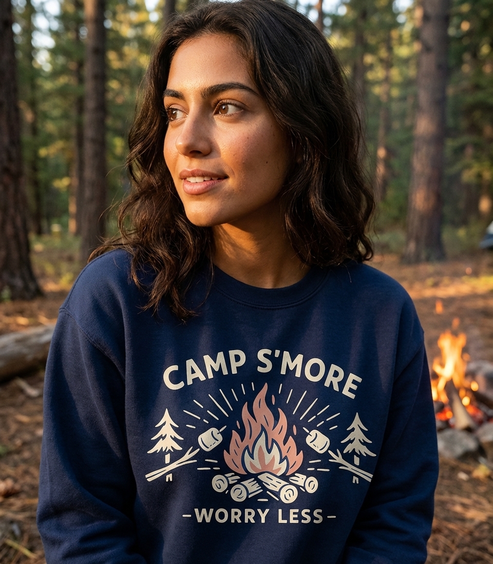 The "Camp S'More Worry Less" phrase captures the lifestyle of passionate outdoor lovers who spend their days roasting marshmallows, telling stories, and finding peace in nature.