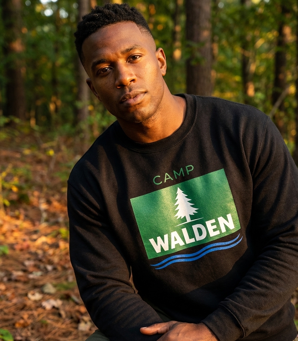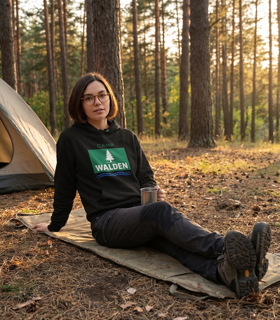"Camp Walden" evokes a sense of rustic escape and connection to nature, reminiscent of serene wilderness retreats and lakeside adventures. It represents a call back to simpler times spent under the open sky.
