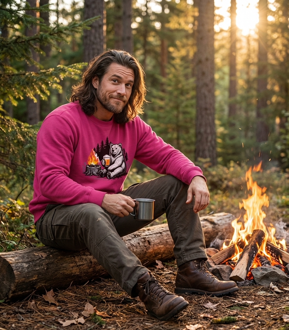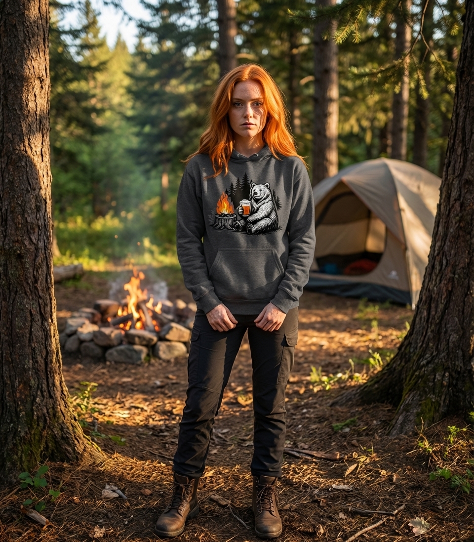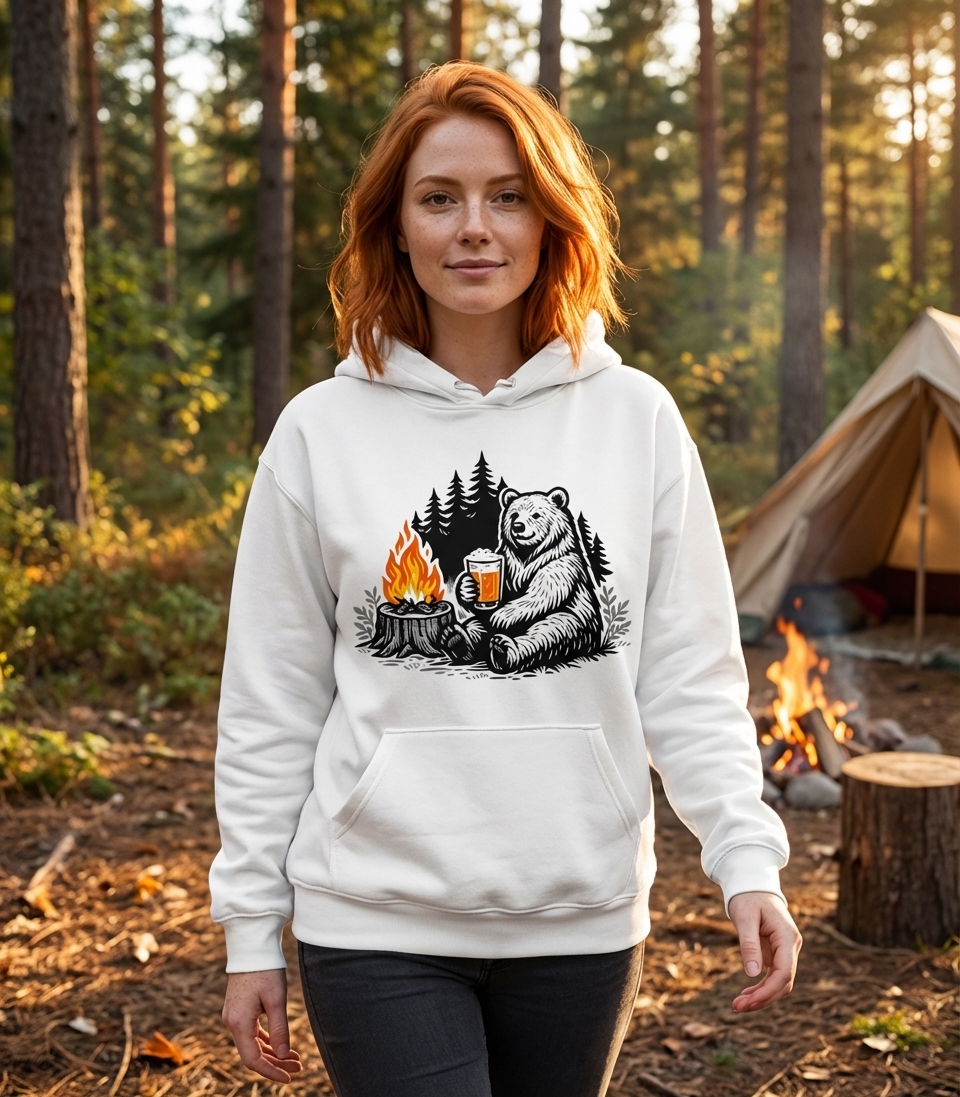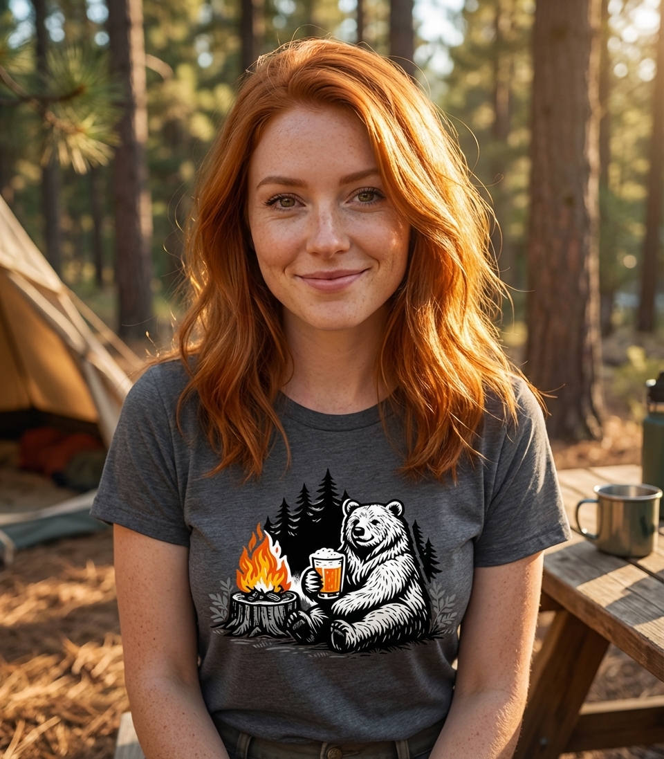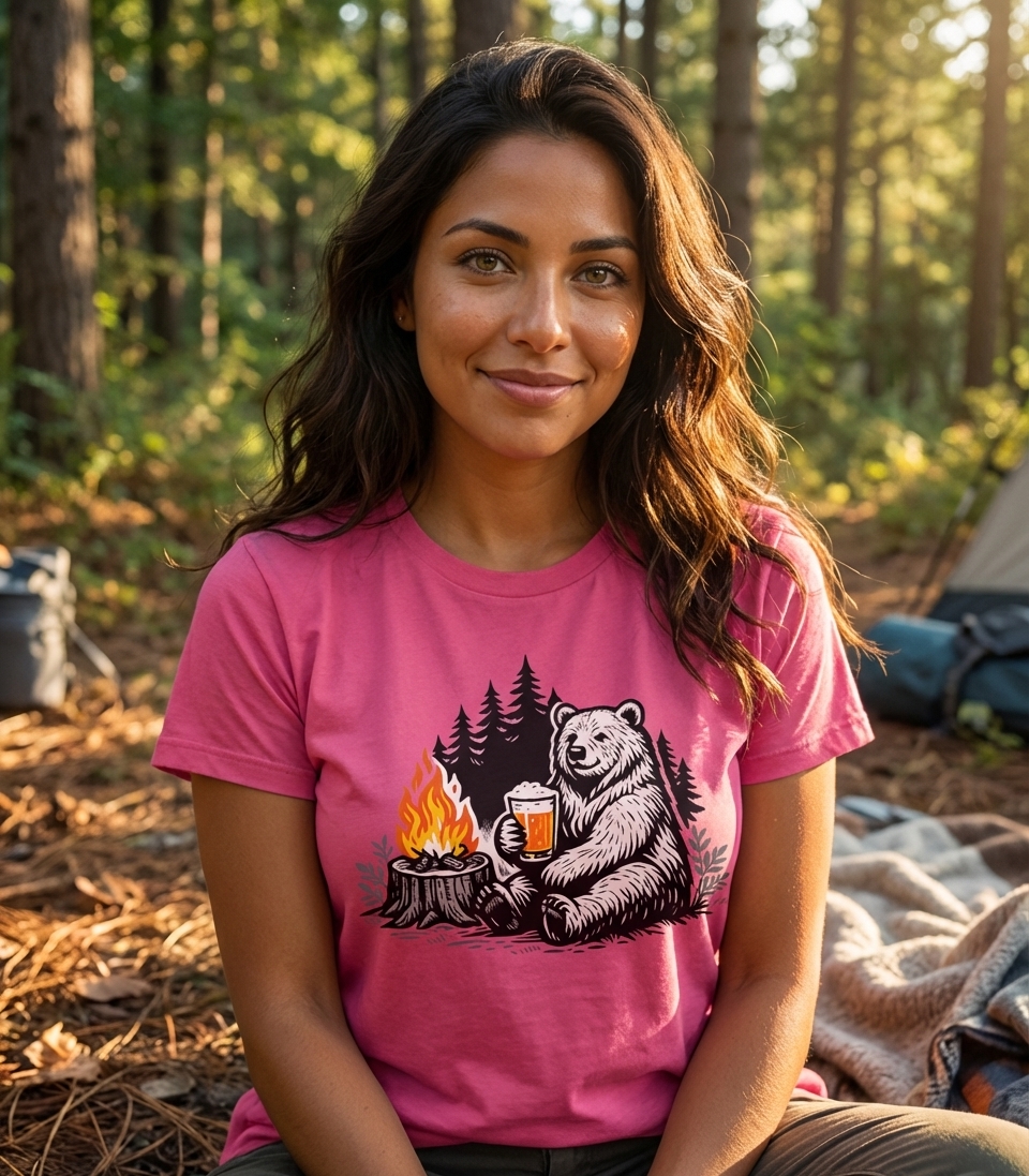 The 'Bear Campfire Beer' design captures the lifestyle of passionate outdoor enthusiasts who spend their days exploring nature, relaxing by the fire, and enjoying a cold brew.