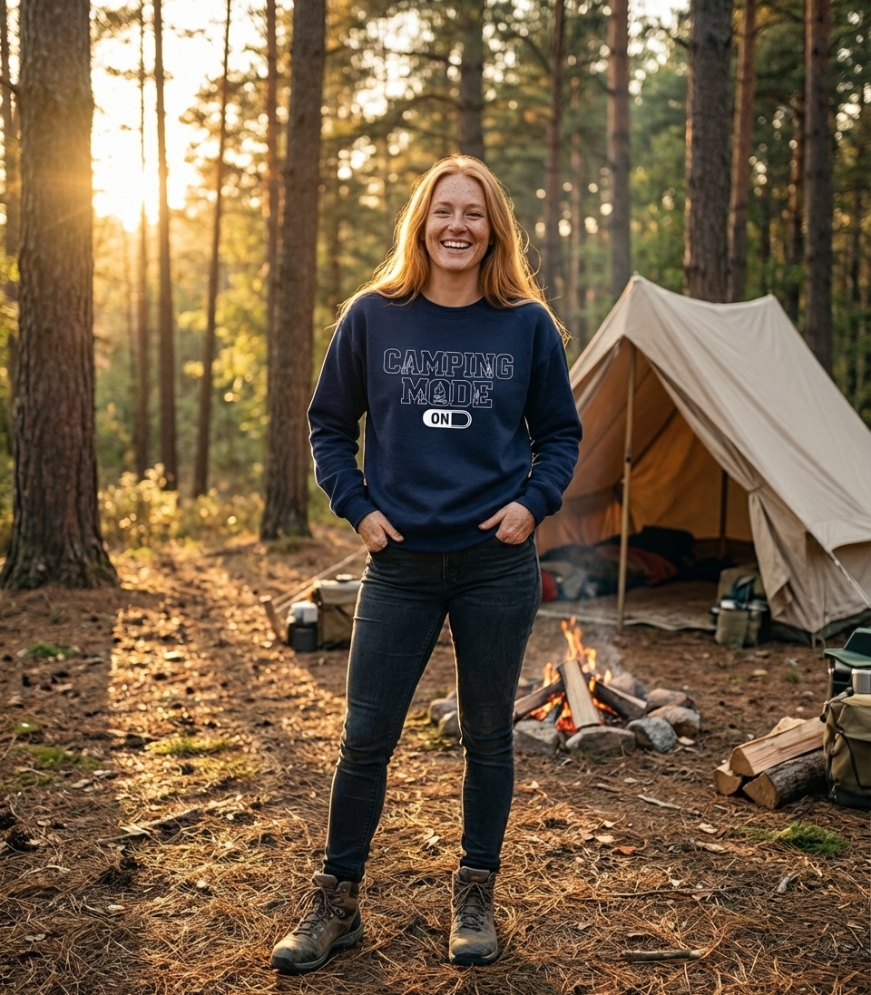 The "Camping Mode On" phrase captures the lifestyle of passionate outdoor lovers who spend their days exploring trails, setting up tents, and enjoying campfires.