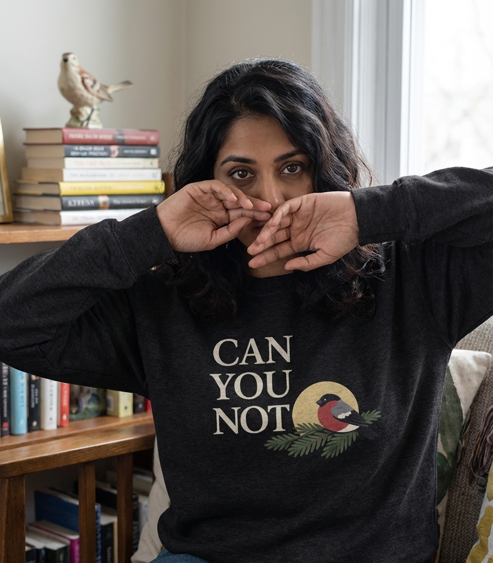 The 'Can You Not' phrase, delivered by a serene bullfinch, perfectly captures the feeling of wanting a moment of peace and quiet with a touch of sarcasm.