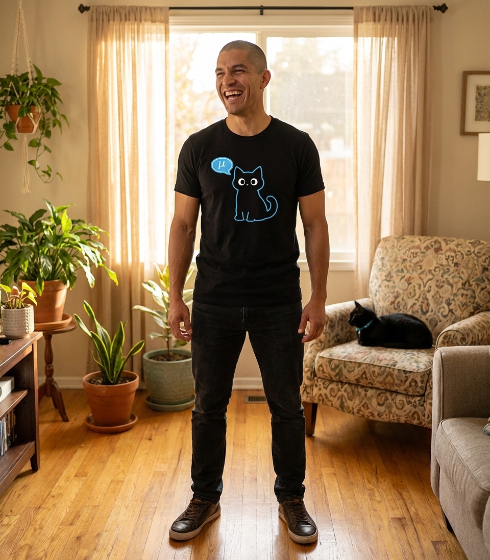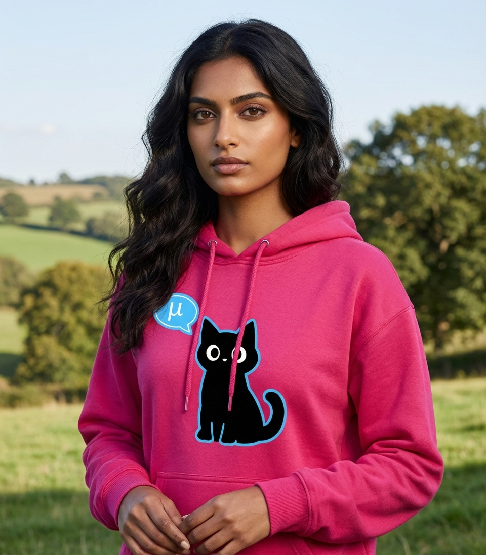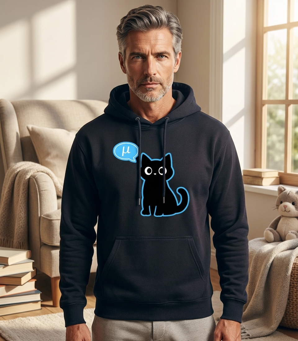 When conceptually spoken by a cat, "μ" cleverly sounds like "meow", making this design a witty nod to physics, math, and feline communication.