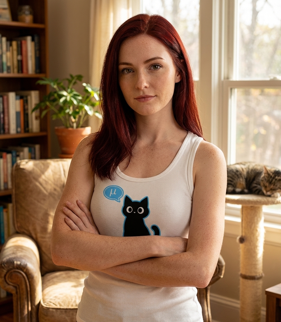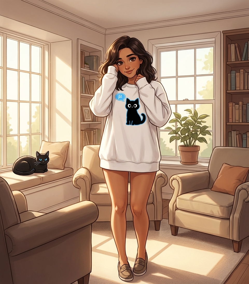 The "μ" symbol captures the lifestyle of clever cat lovers who appreciate physics, math, and a good pun.