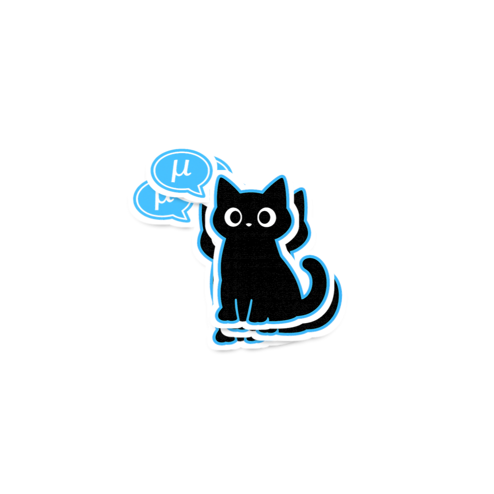 This minimalist design features a charming black cat with a bright blue outline. A speech bubble above its head contains the Greek letter "μ", creating a clever visual pun.