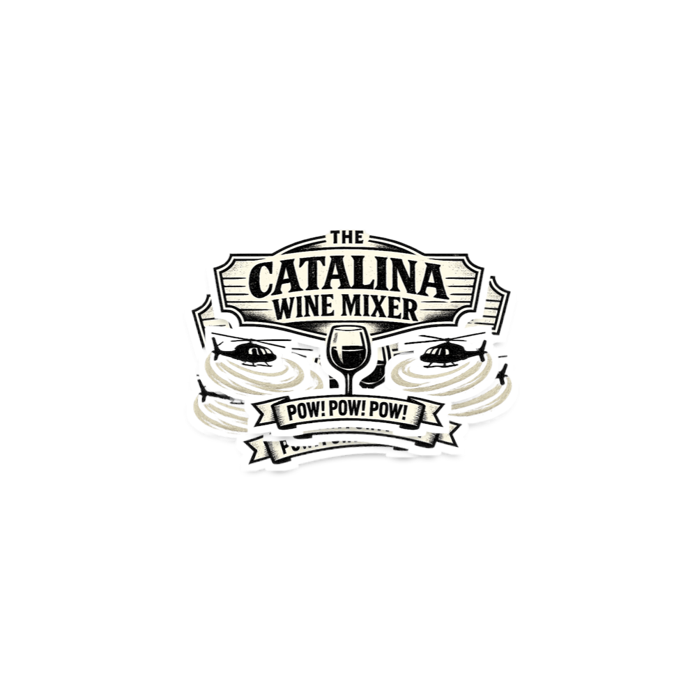 This design features the iconic phrase 'The Catalina Wine Mixer' in a vintage, distressed style. It combines imagery of a wine glass with turntable-like elements, creating a visual pun that hints at a lively event.