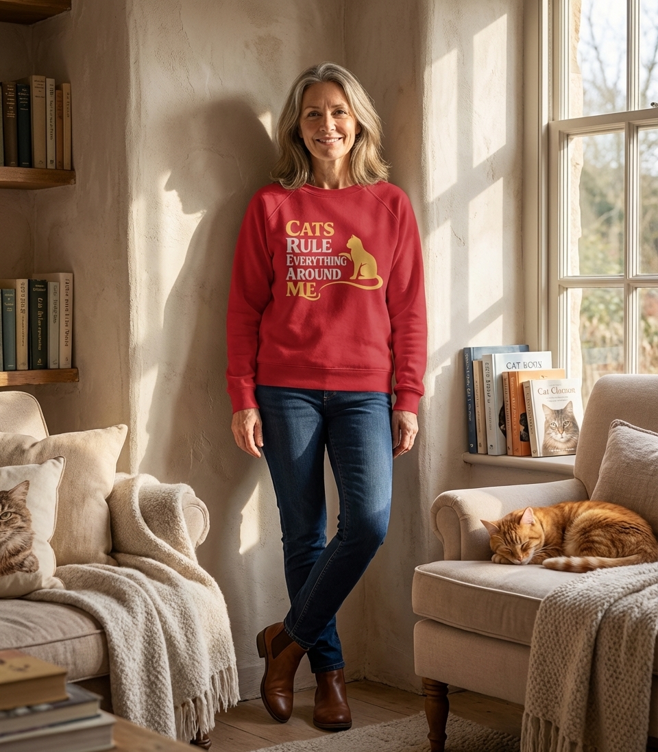 The "Cats Rule Everything Around Me" phrase captures the lifestyle of passionate cat owners who spend their days tending to their feline friends, adoring their antics, and embracing their role as pet parents.