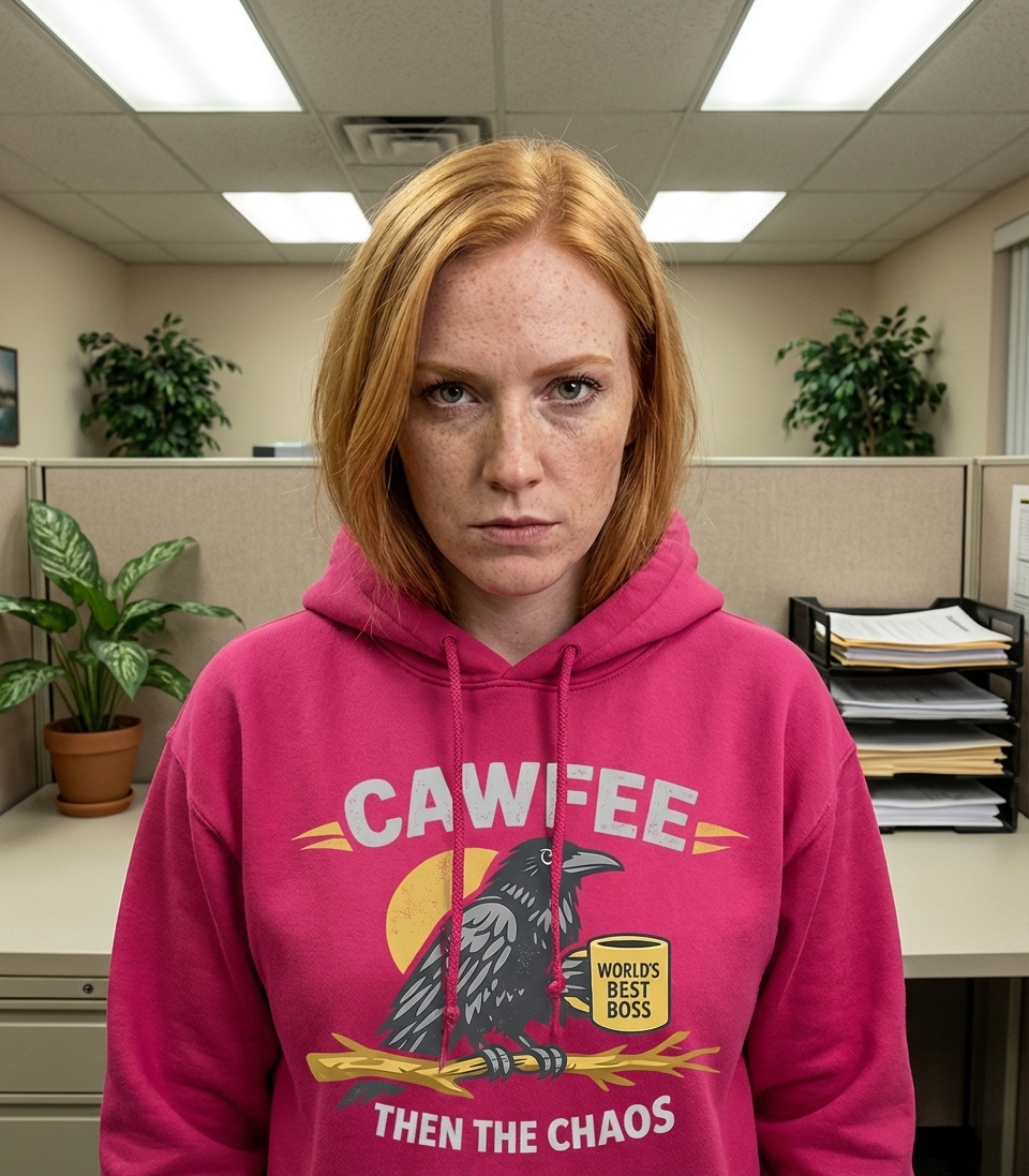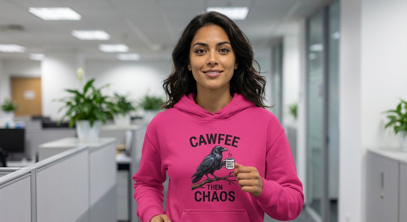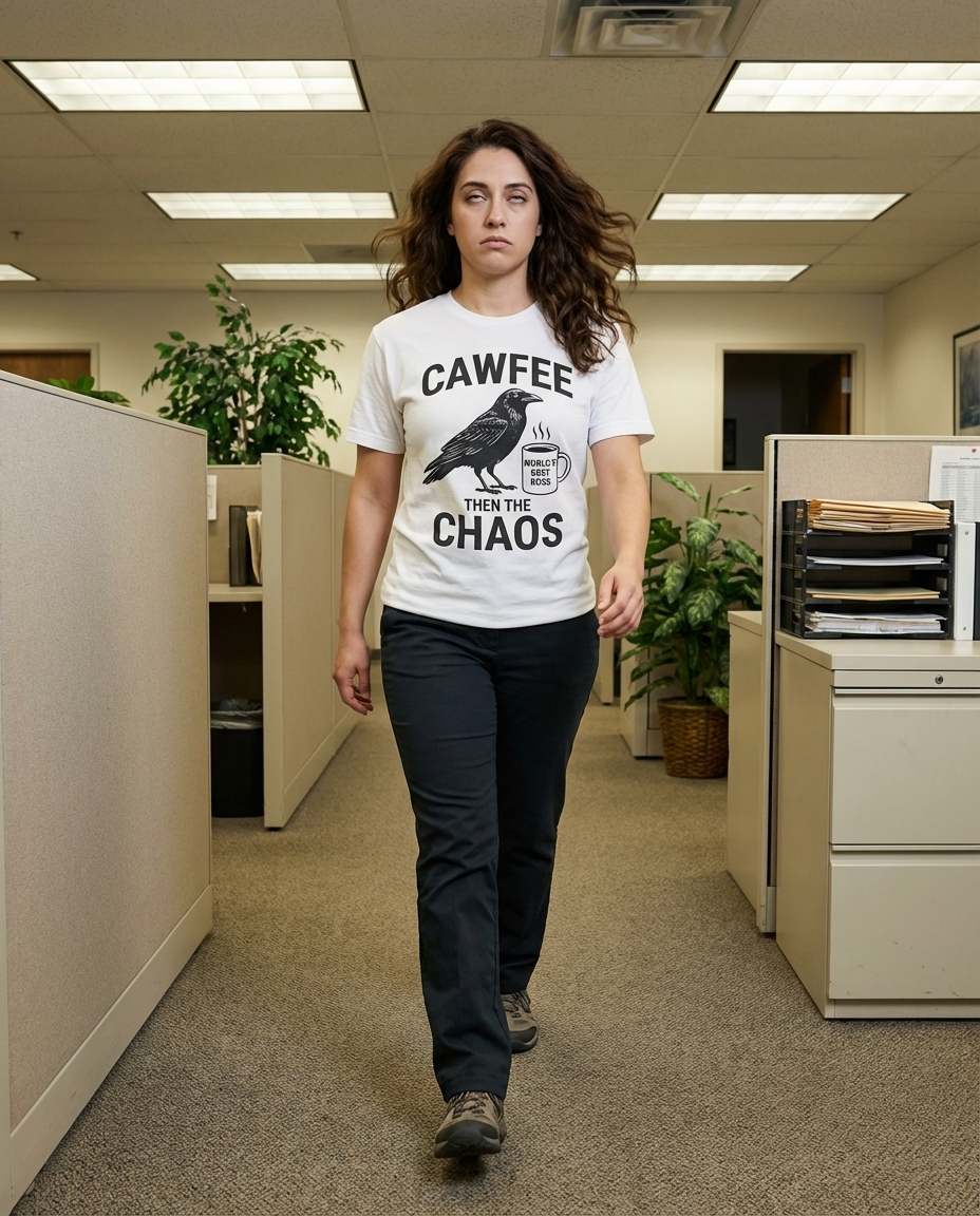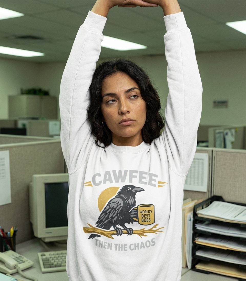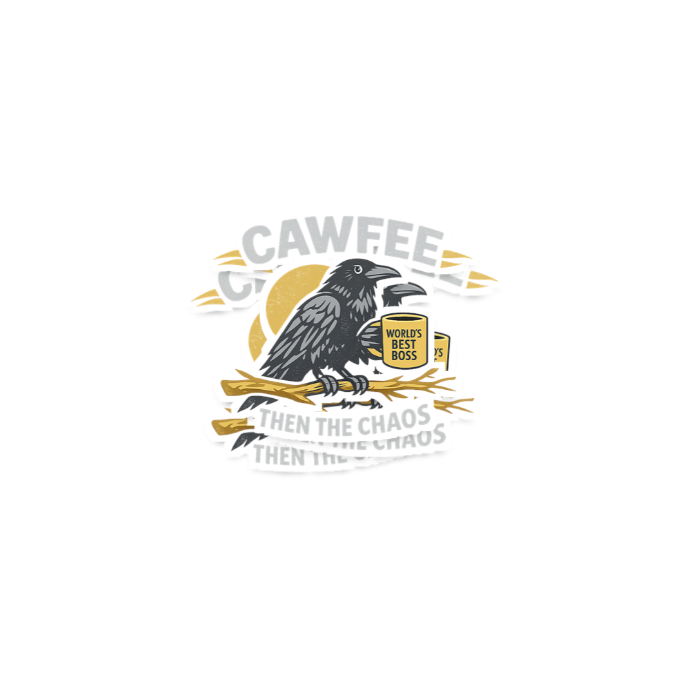 This design features a clever crow, perched on a branch, thoughtfully clutching a coffee mug. Above the scene, the bold text "CAWFEE" sets the stage for a day ahead.