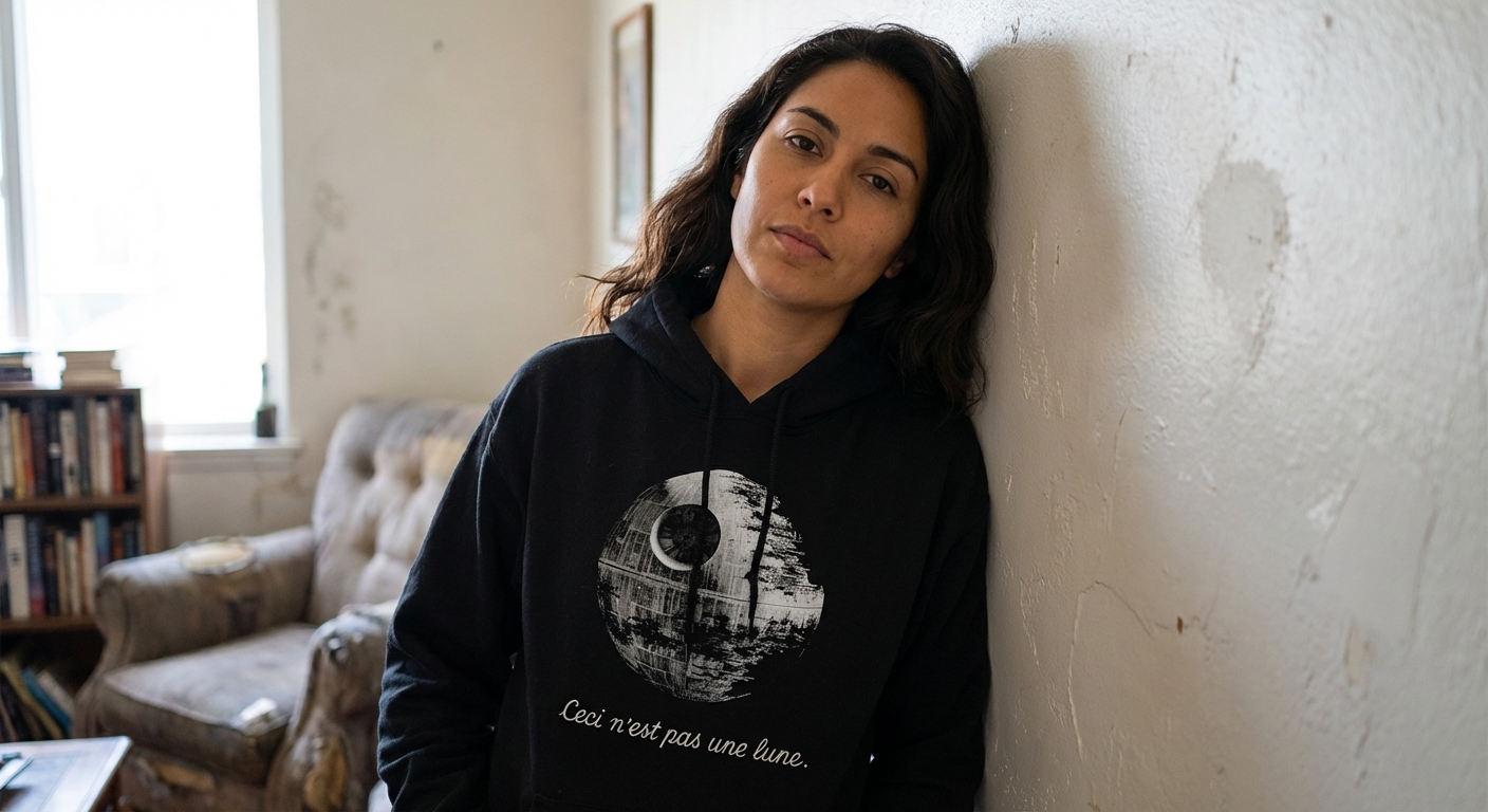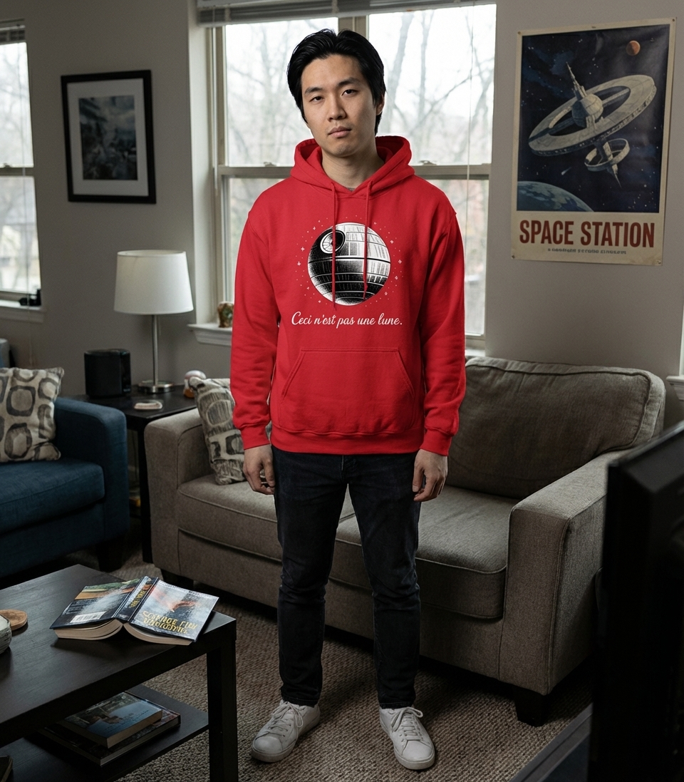 The 'Ceci n'est pas une lune' phrase captures the clever wit of Star Wars fans who appreciate art parodies, iconic movie quotes, and sci-fi humor.