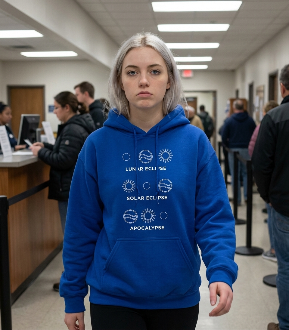 The design leverages common astronomical terms like "Lunar Eclipse" and "Solar Eclipse" to set up a punchline with "Apocalypse." It's a classic setup and payoff joke, using familiar scientific imagery to deliver a surprising and comical twist on cosmic order.