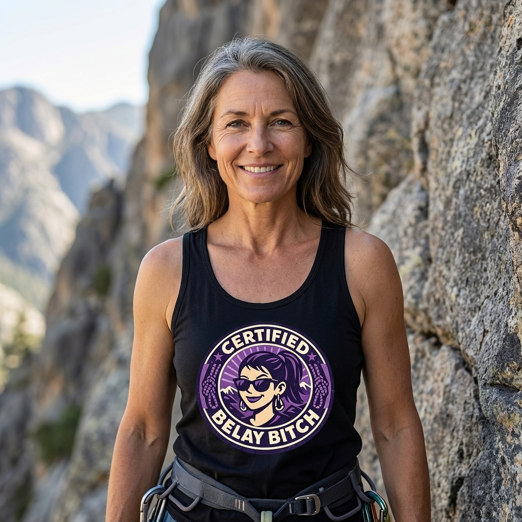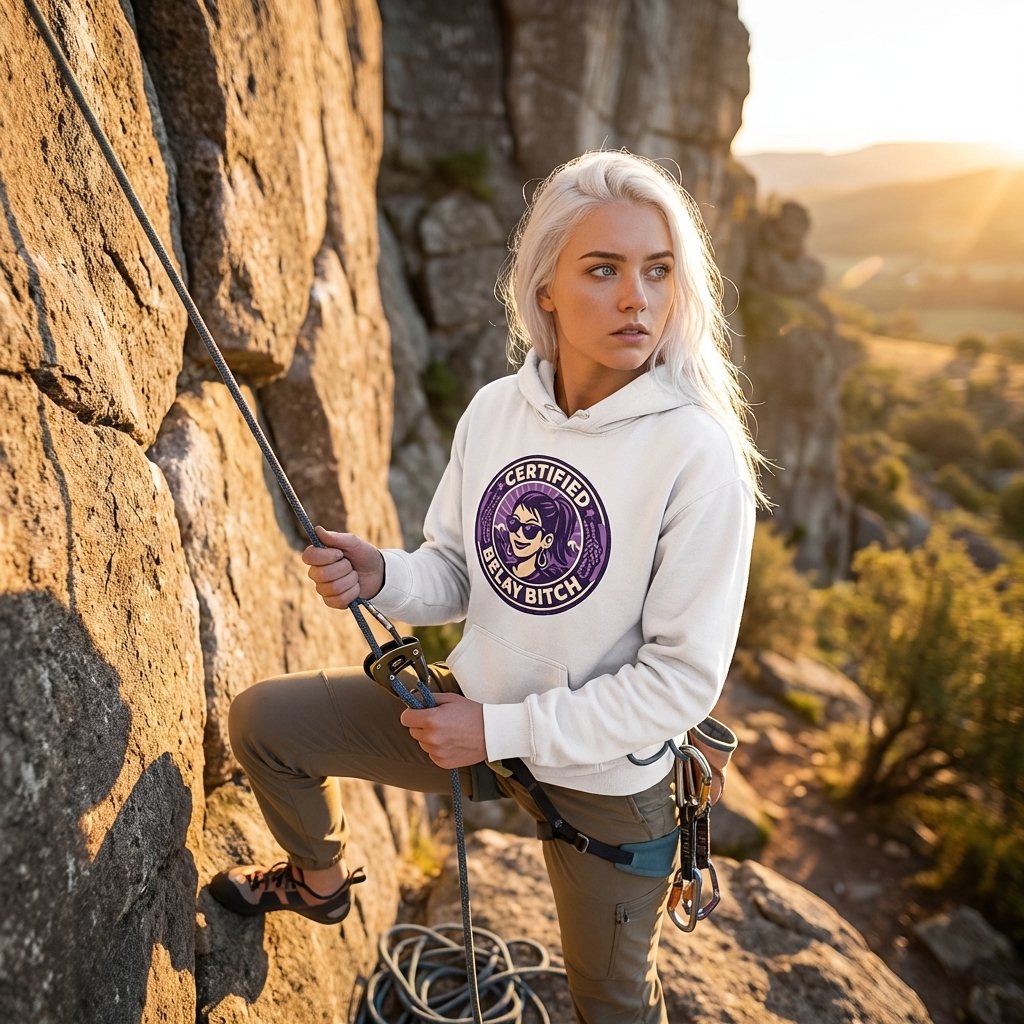 The 'Certified Belay Bitch' phrase captures the lifestyle of strong female rock climbers who fearlessly belay, support their partners, and embrace the challenges of the outdoors.