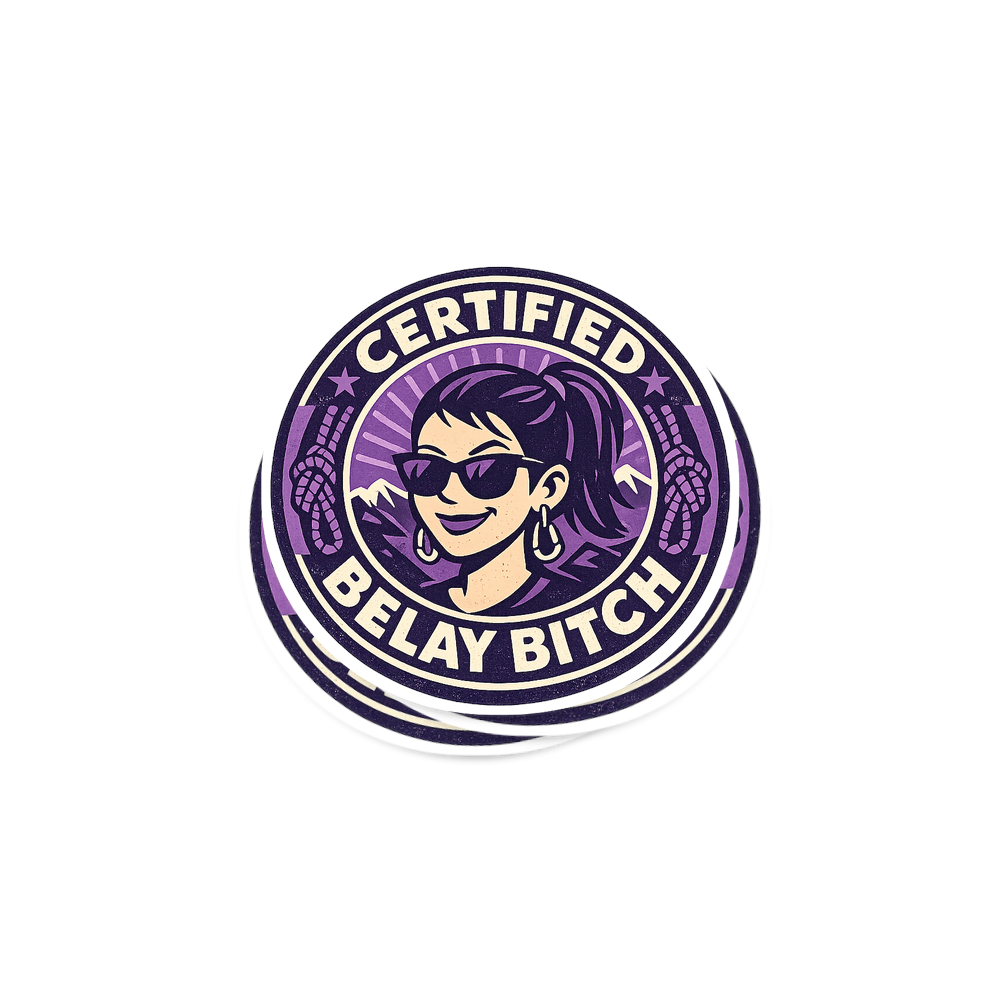 The phrase "Certified Belay Bitch" is a humorous and empowering take on the crucial role of a belayer in rock climbing. A belayer is responsible for safely managing the rope and protecting their climbing partner.