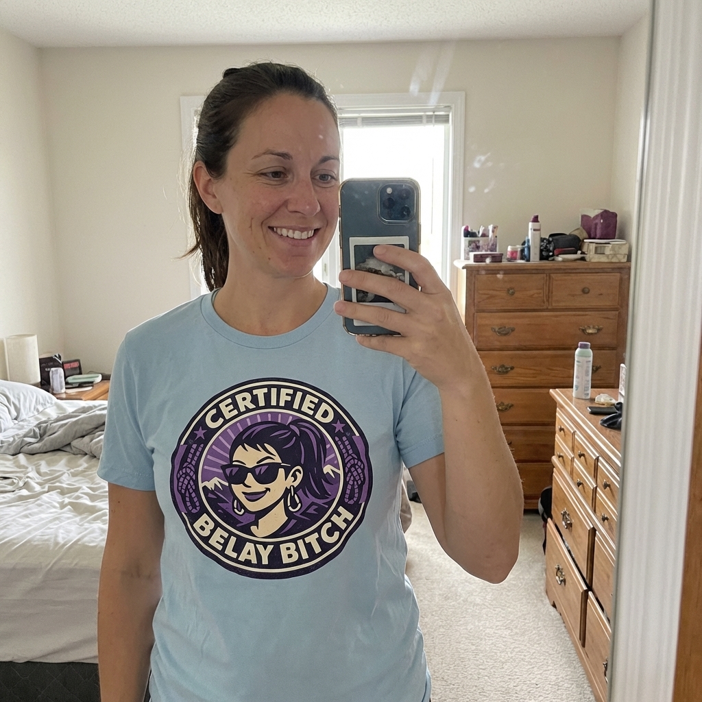 This shirt is super comfy, honestly. And the 'Certified Belay Bitch' design? lol, it's perfect for the crag, definitely gets a few chuckles. So glad I snagged this.