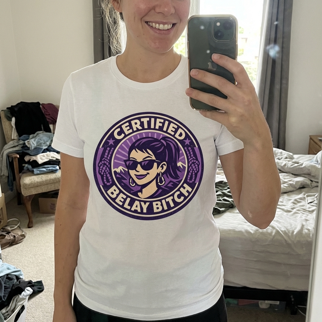 okay so this shirt just arrived and it's awesome. The fabric feels great, really soft, and the "certified belay bitch" print is exactly what I wanted – totally my vibe. Already thinking about wearing it to the gym this week, haha.