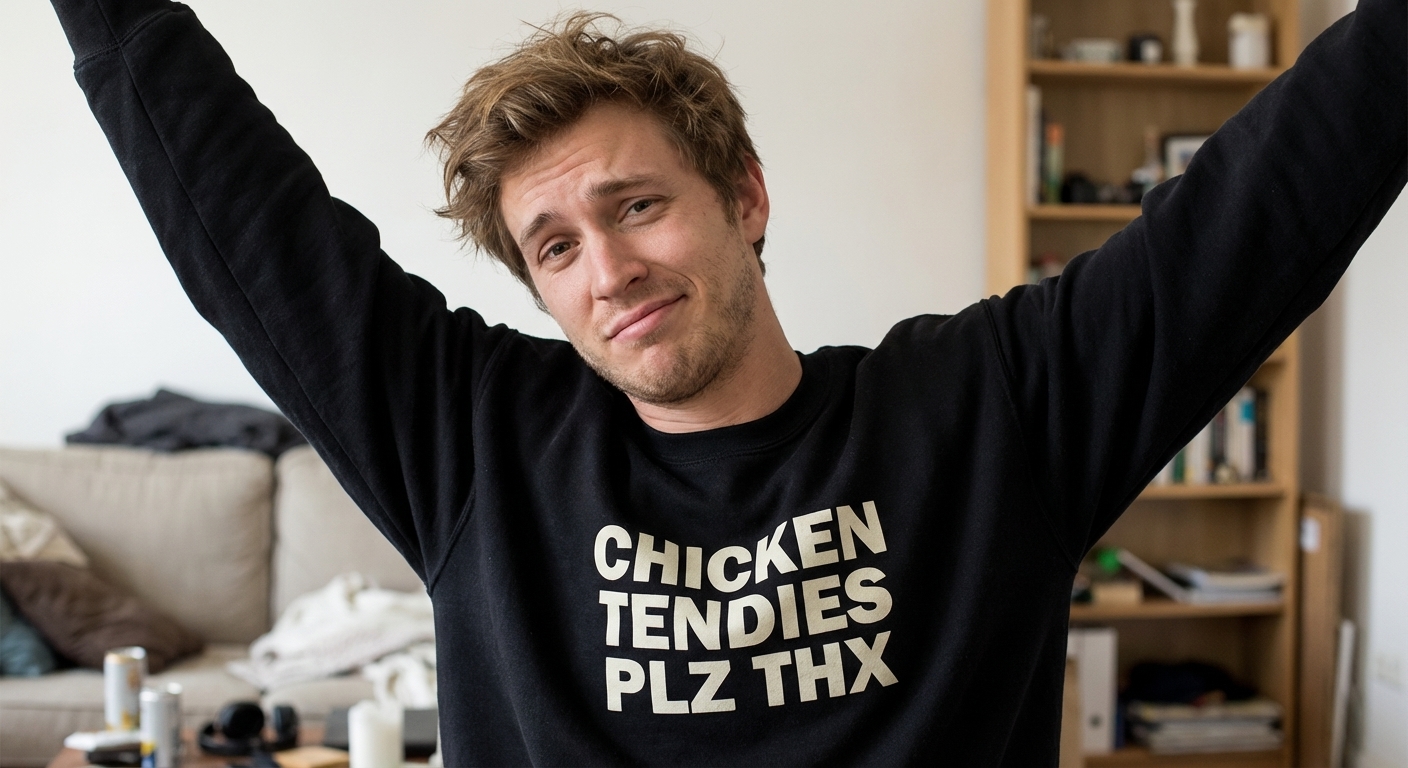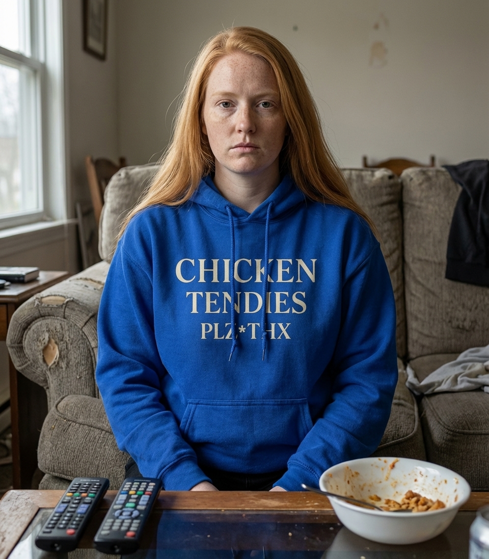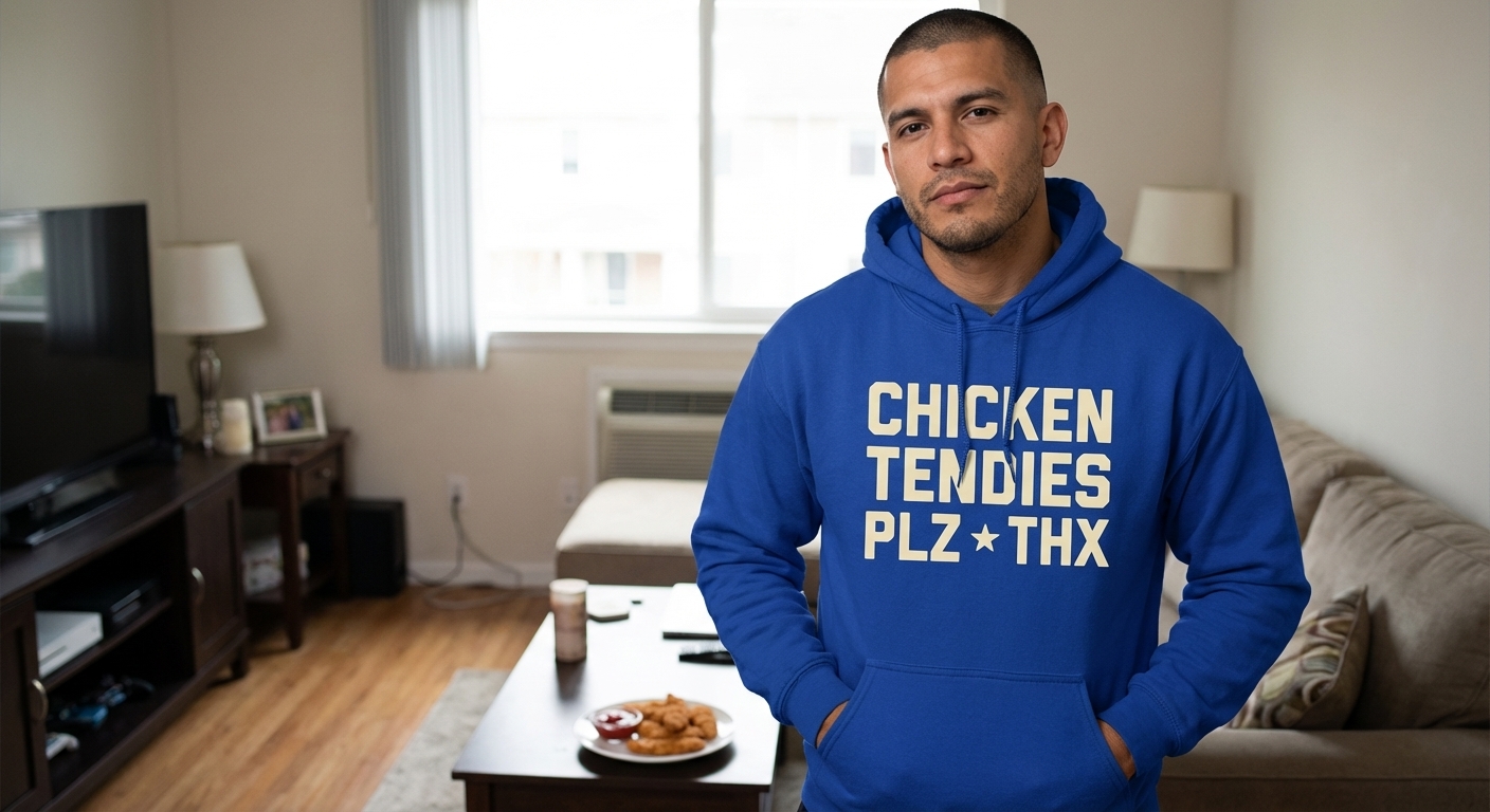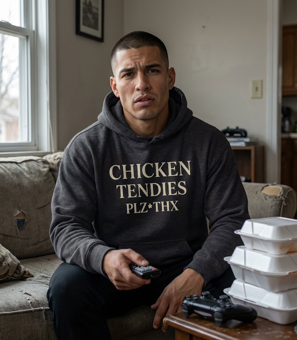 The 'Chicken Tendies Plz Thx' phrase captures the lifestyle of anyone who loves comfort food and isn't afraid to politely demand their favorite snack.