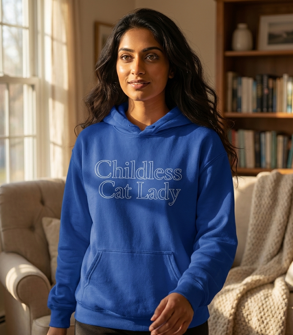 The 'Childless Cat Lady' phrase captures the self-aware and humorous lifestyle of dedicated cat enthusiasts who cherish their feline companions, embrace their independent path, and find joy in their pet-filled home.