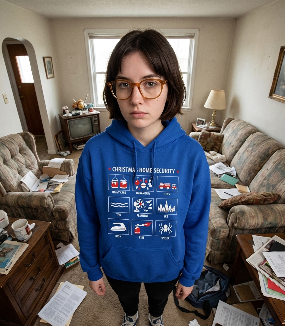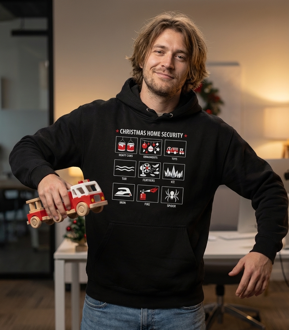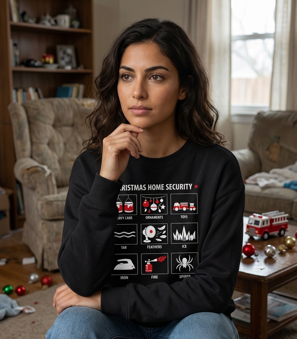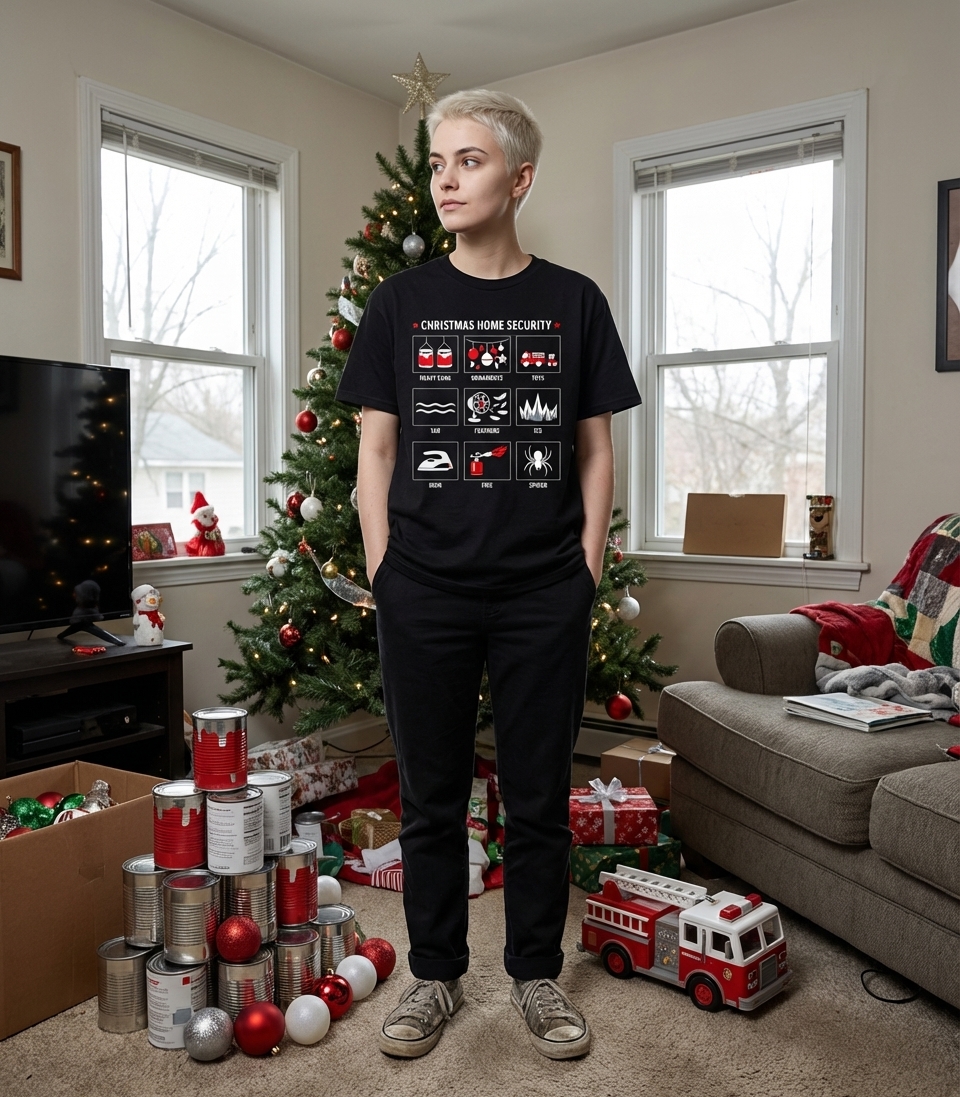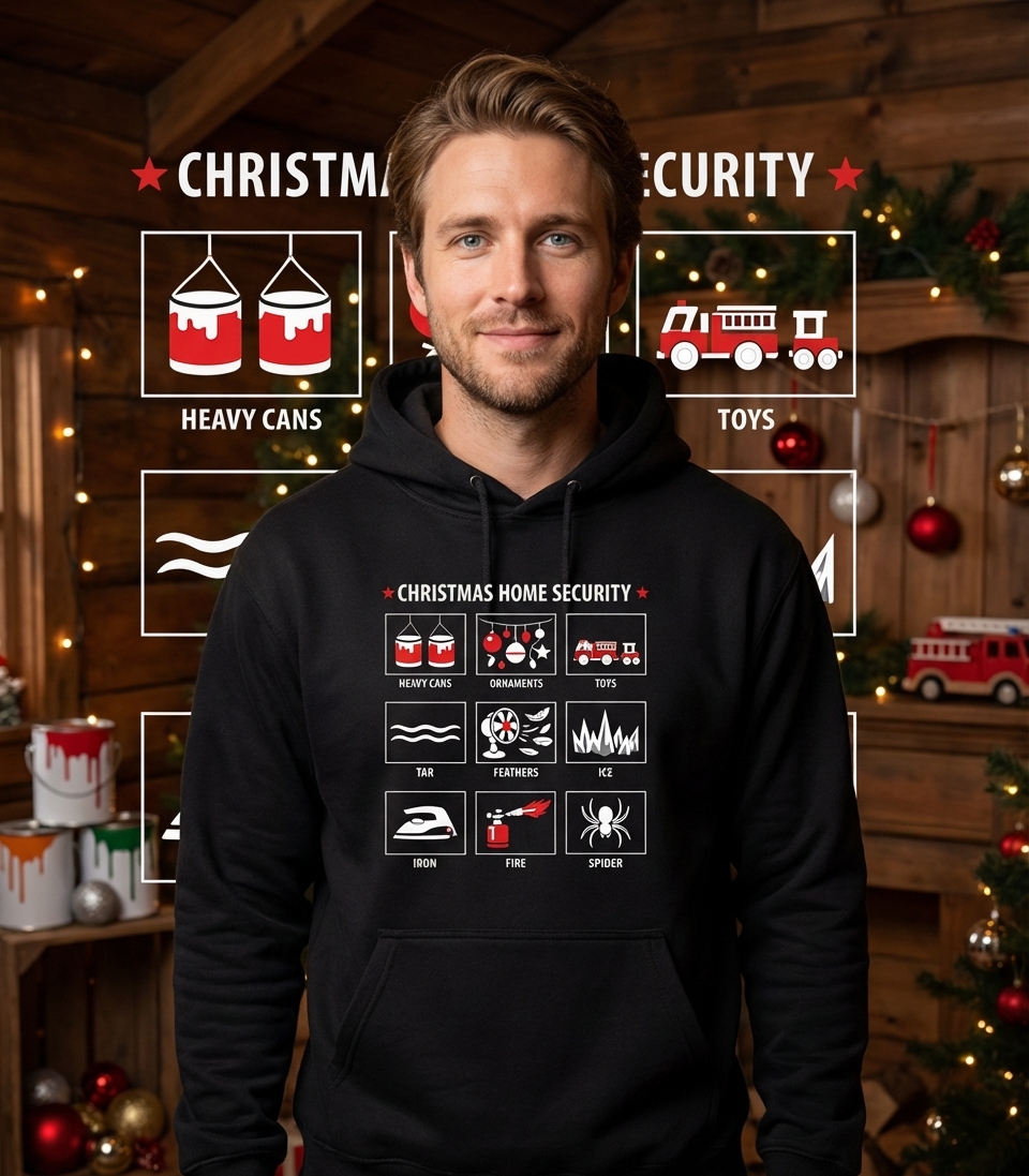 The phrase "Christmas Home Security" humorously implies a heightened state of alert during the holidays, where ordinary household objects become tools for protection. It evokes a sense of lighthearted vigilance, perfect for those who appreciate a clever and unexpected twist on holiday themes.