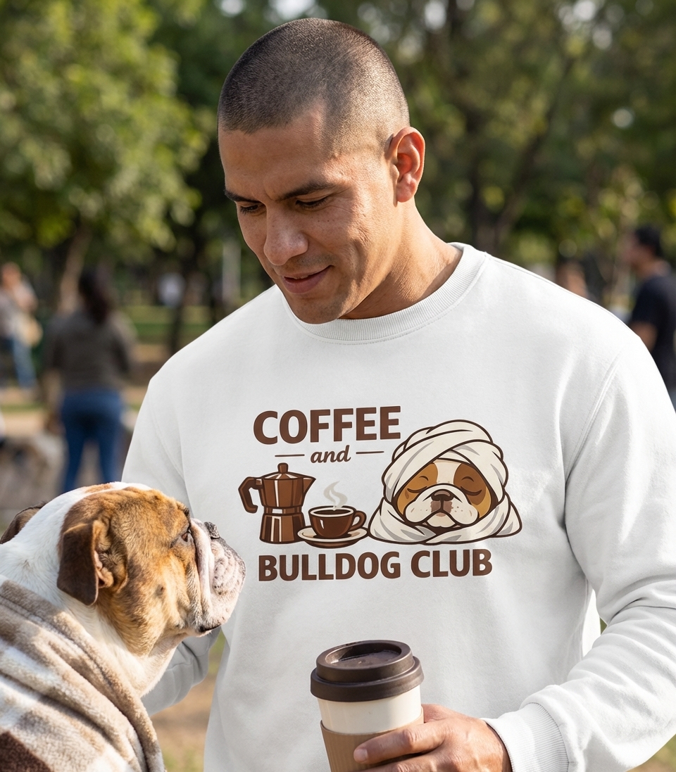 The "Coffee and Bulldog Club" phrase captures the relaxed lifestyle of passionate bulldog owners and coffee enthusiasts who enjoy quiet mornings, cozy moments, and the companionship of their beloved pets.