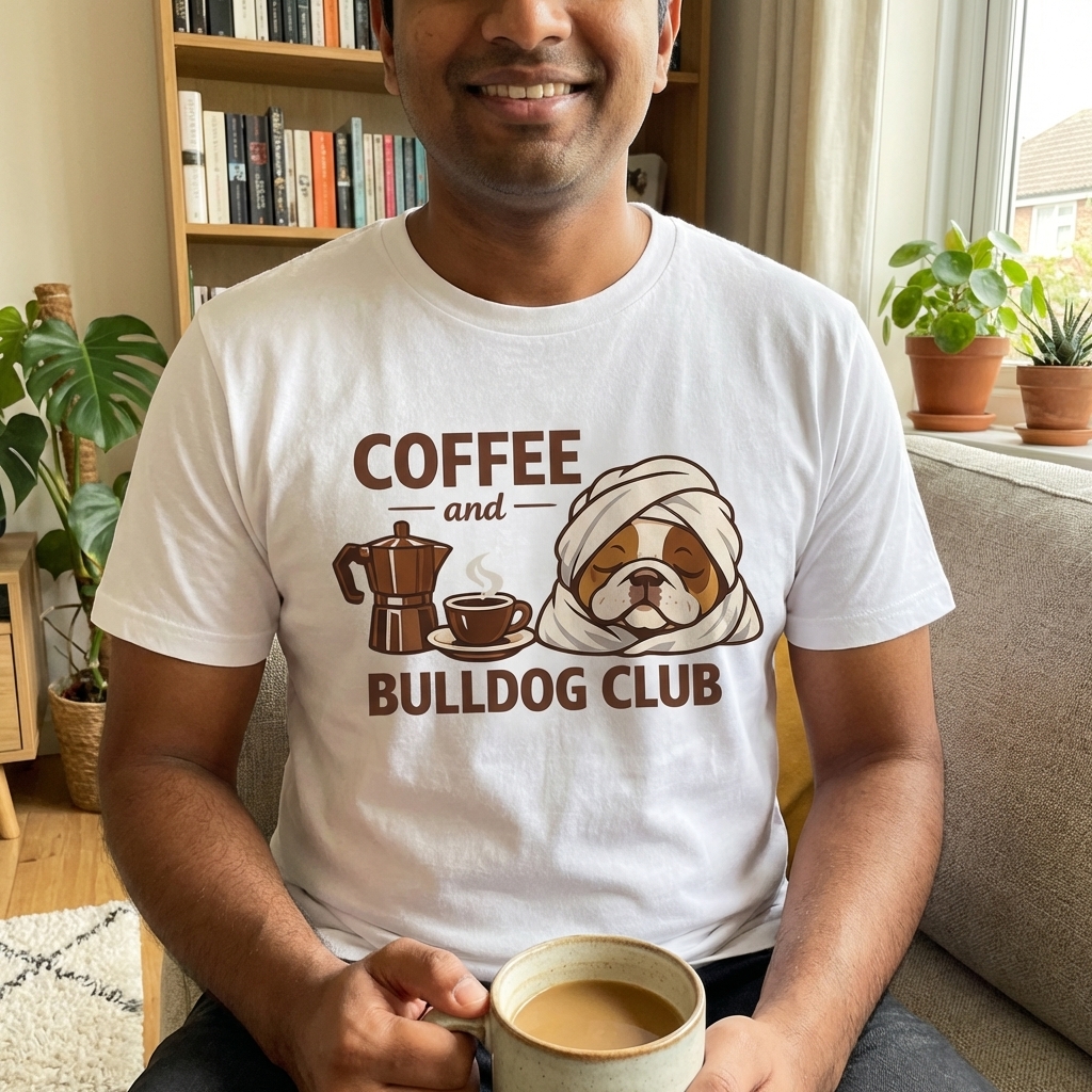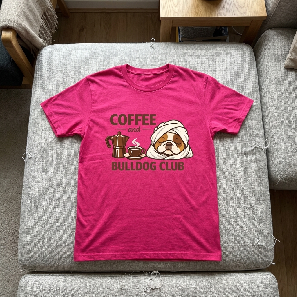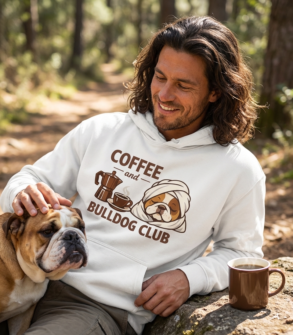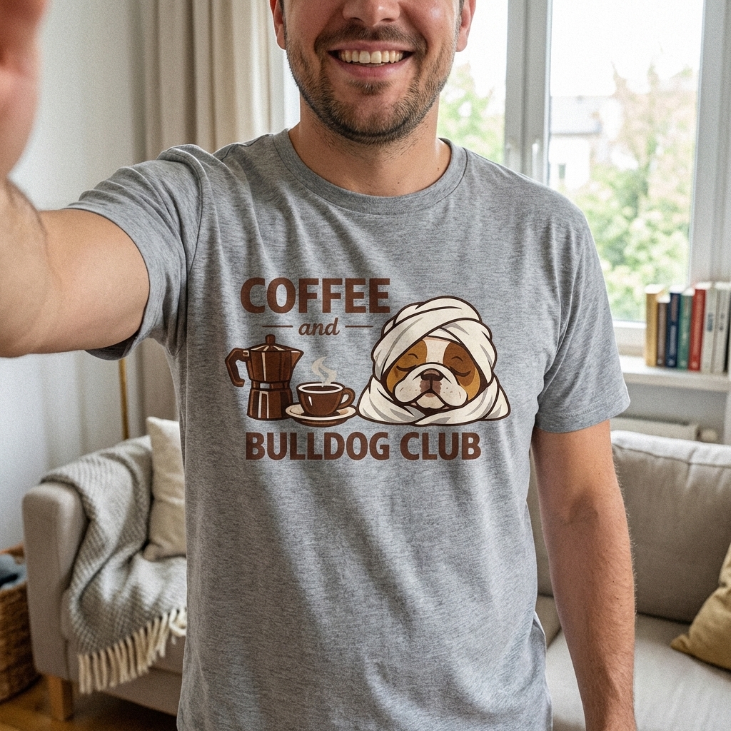 This charming graphic features a sleepy bulldog wrapped in a towel, alongside a steaming cup of coffee and a moka pot. It perfectly blends the love for quiet mornings and the unique companionship of a bulldog, celebrating a relaxed start to the day.