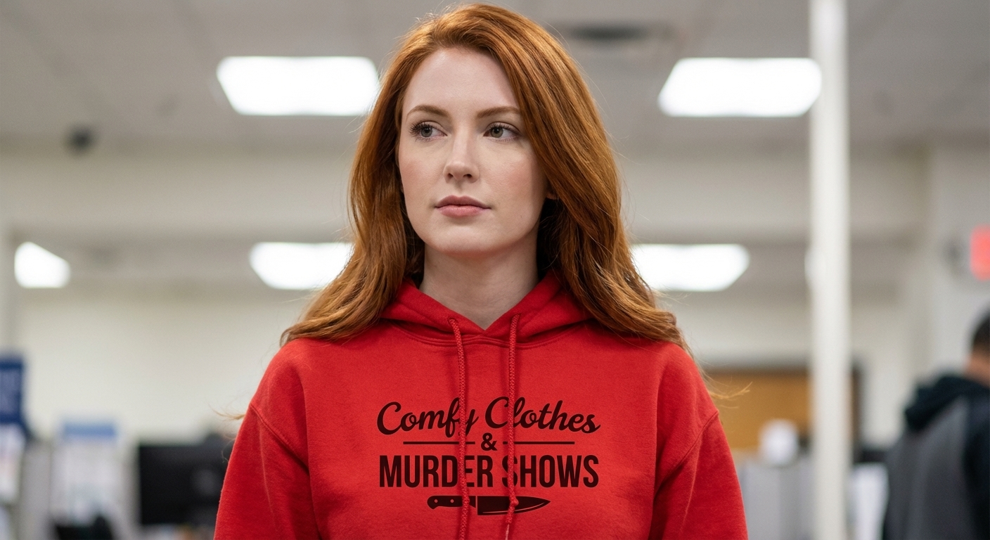 This graphic perfectly combines the comfort of a relaxed evening with the thrill of investigative storytelling. It's an ideal statement piece for anyone whose perfect night involves soft fabric and gripping true crime narratives.