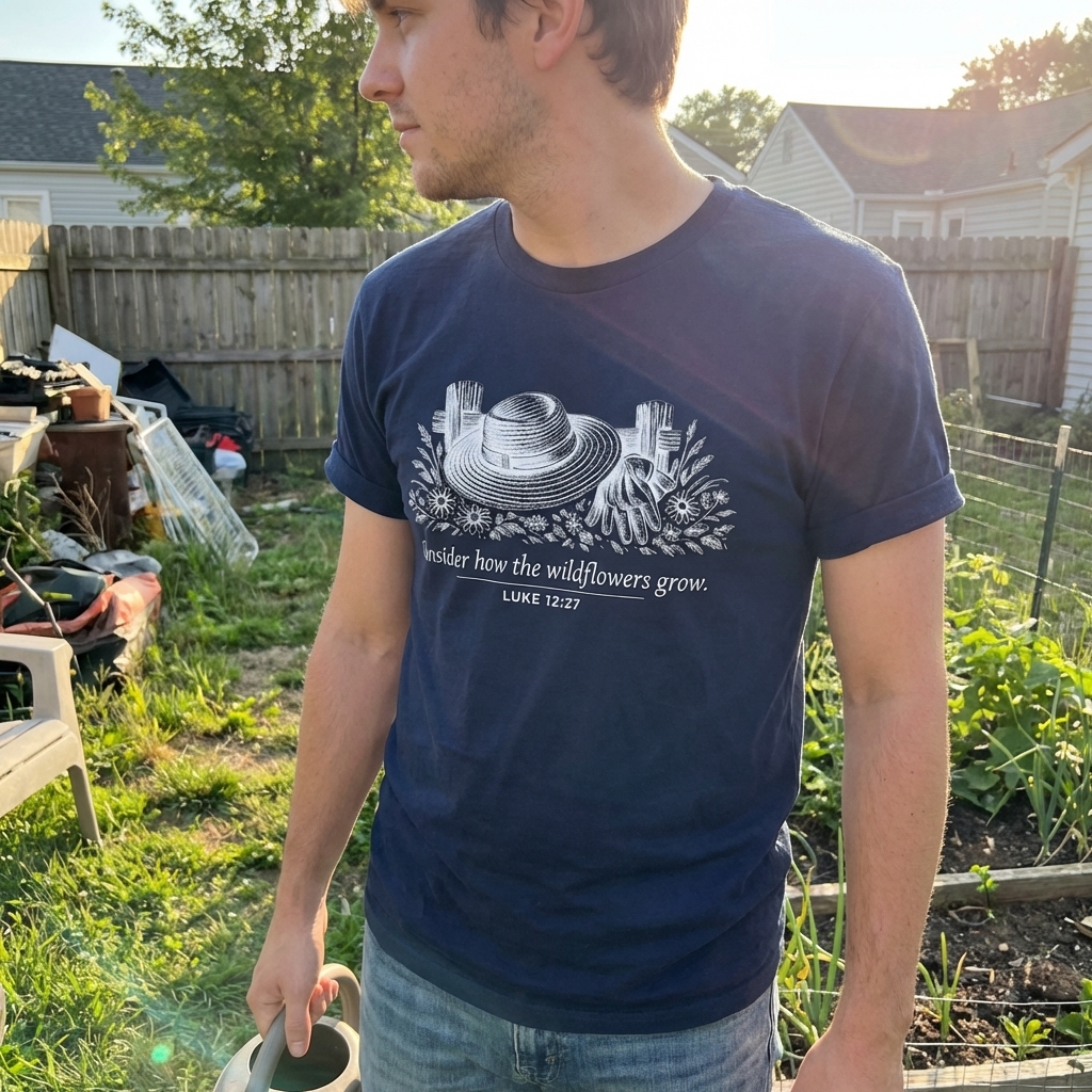 This artwork beautifully illustrates the biblical message of faith and nature. It features a rustic straw hat and gardening gloves resting against a wooden fence, surrounded by delicate wildflowers.