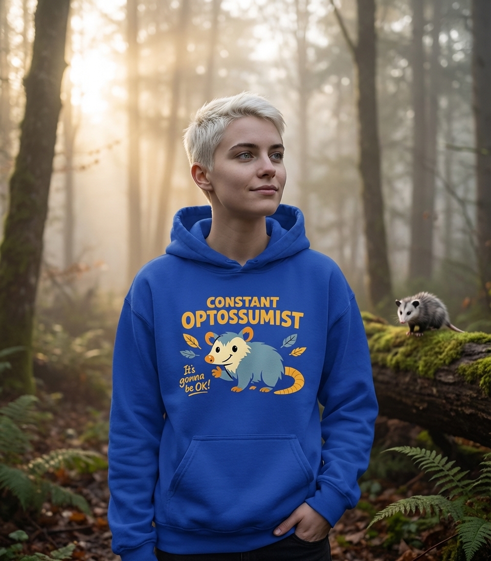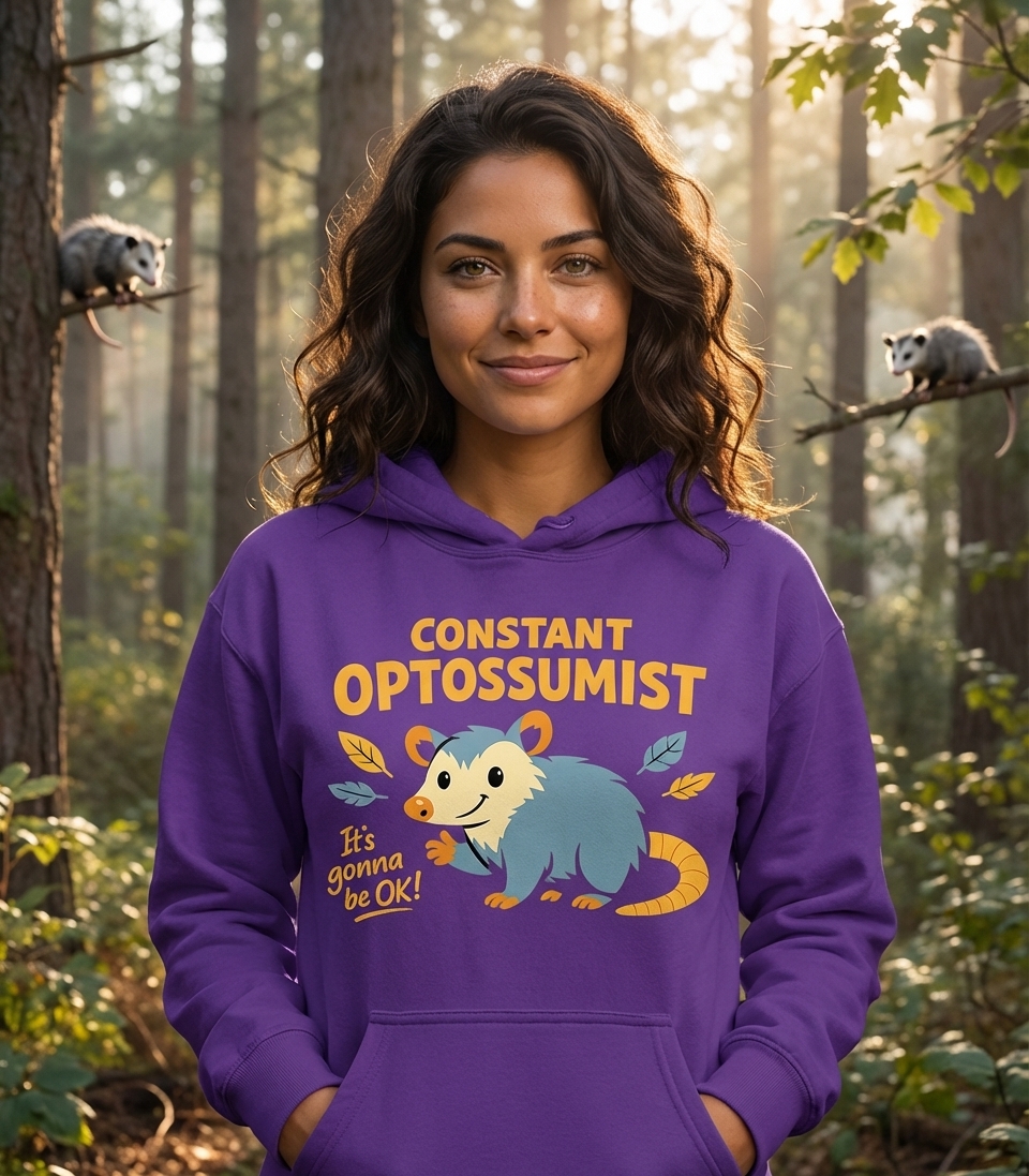 The phrase "Constant Optossumist" is a clever pun combining "opossum" with "optimist." It signifies someone who maintains a positive outlook, much like an opossum playing 'possum' to get through tough situations, but in a humorous, hopeful way.