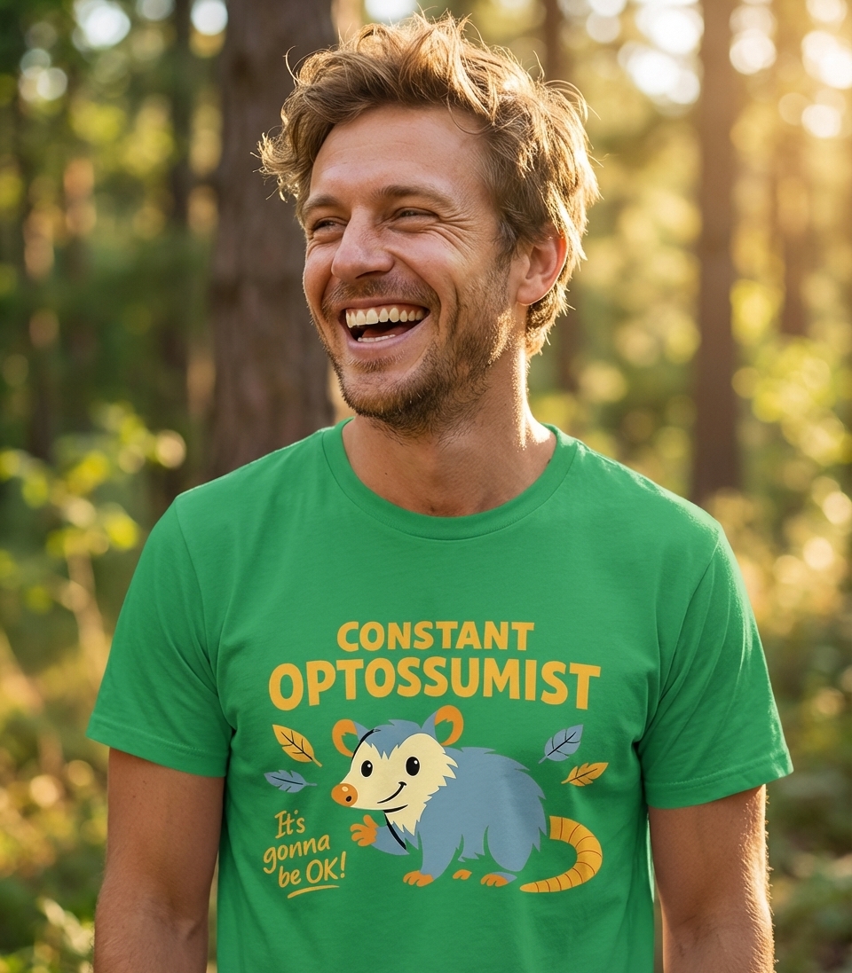 The 'Constant Optossumist' phrase captures the lifestyle of optimistic animal lovers who find humor in everyday challenges, always believing things will work out.