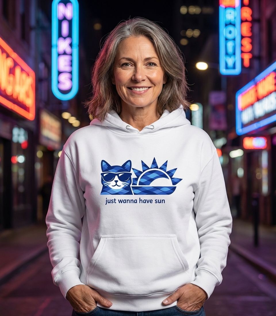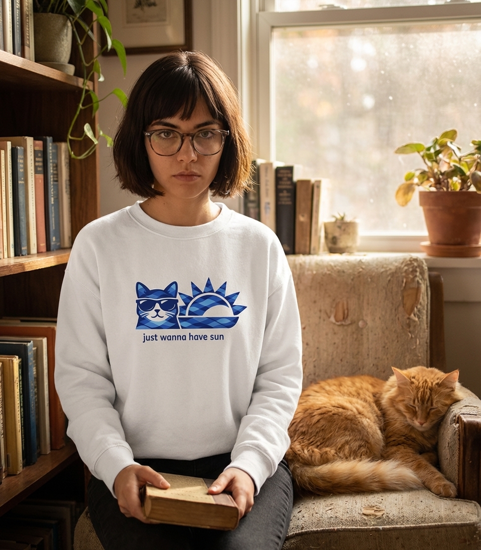 The 'Just Wanna Have Sun' phrase captures the lifestyle of laid-back cat lovers who enjoy soaking up rays, relaxing by the water, and embracing warm weather.