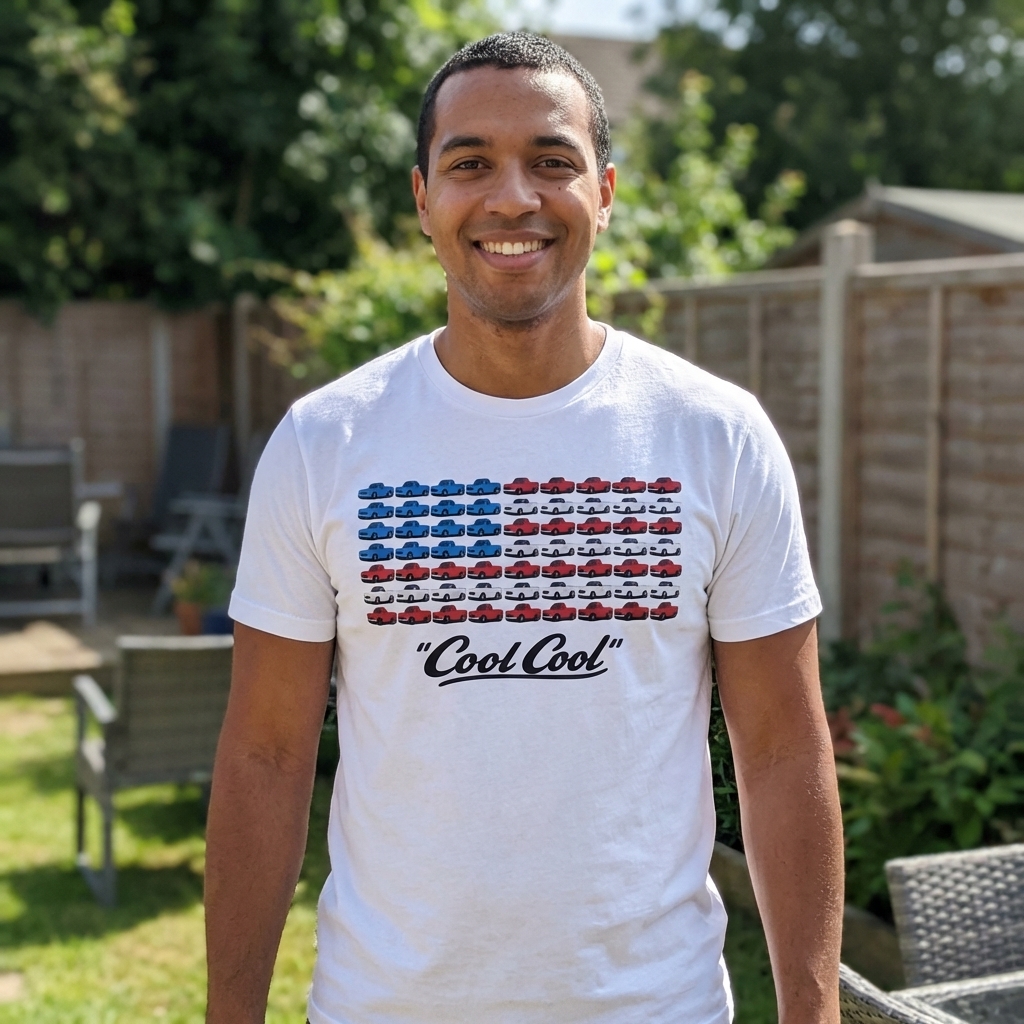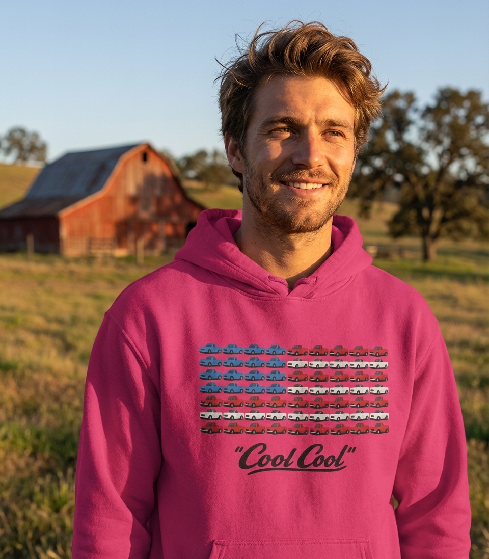 This graphic reimagines the iconic American flag, constructing its stripes and field of stars entirely from an array of classic pickup trucks. The design visually merges national pride with a love for automotive culture, presenting a unique take on a cherished symbol. Below the truck-formed flag, the casual phrase "Cool Cool" adds a relaxed and appreciative tone.