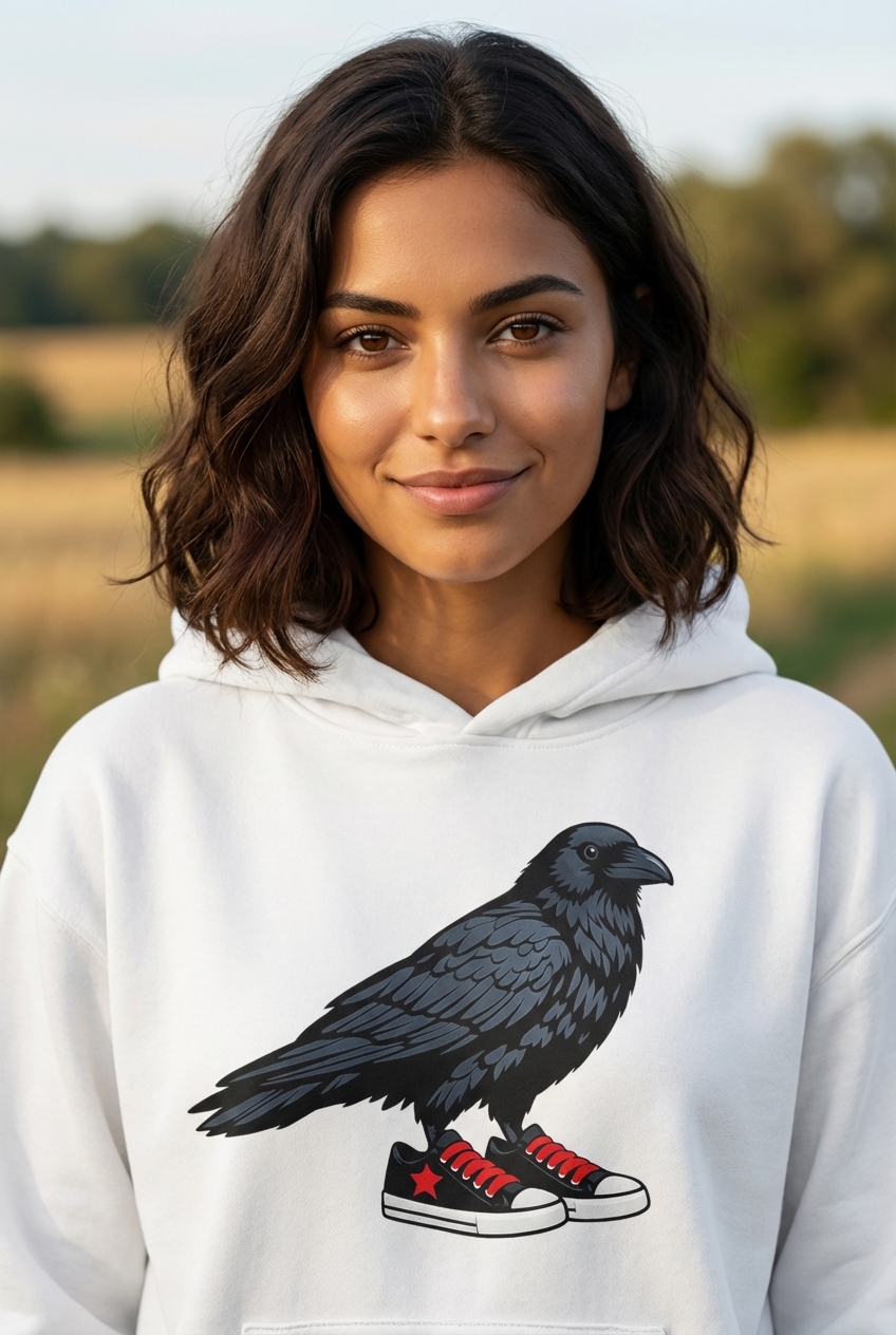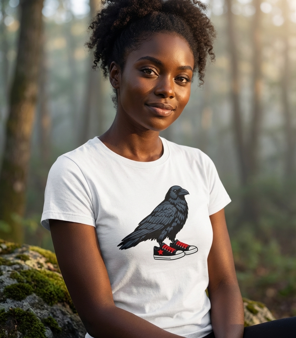 The artwork presents a striking, stylized graphic of a crow or raven. This dark-feathered bird stands out with an unexpected twist: it's wearing a pair of classic canvas-style sneakers, complete with vibrant red laces and a star detail.